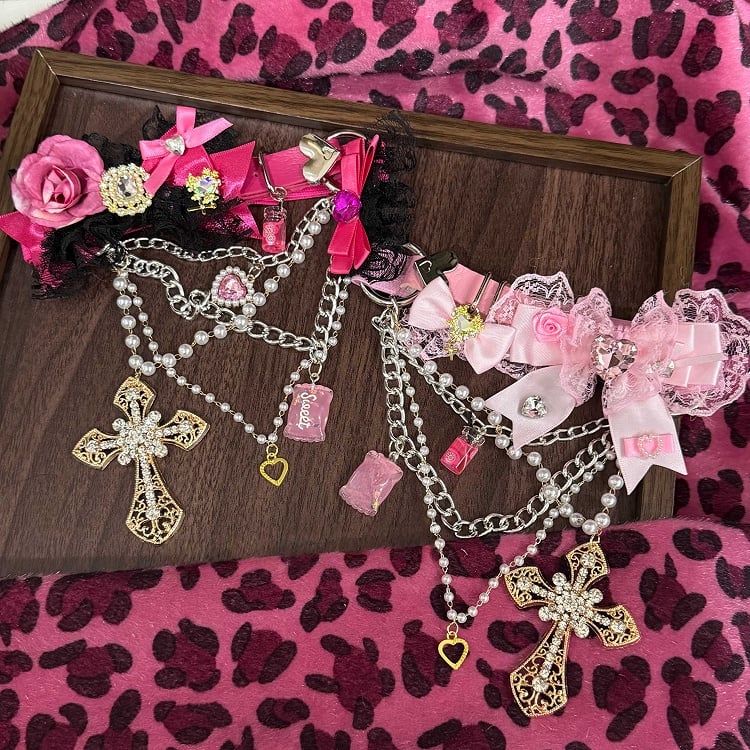 Pink & Black Lace Garter - Rose, Cross & Bow Decor