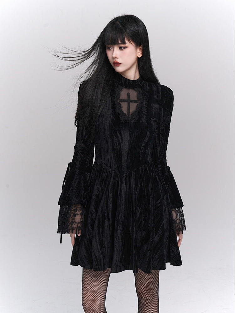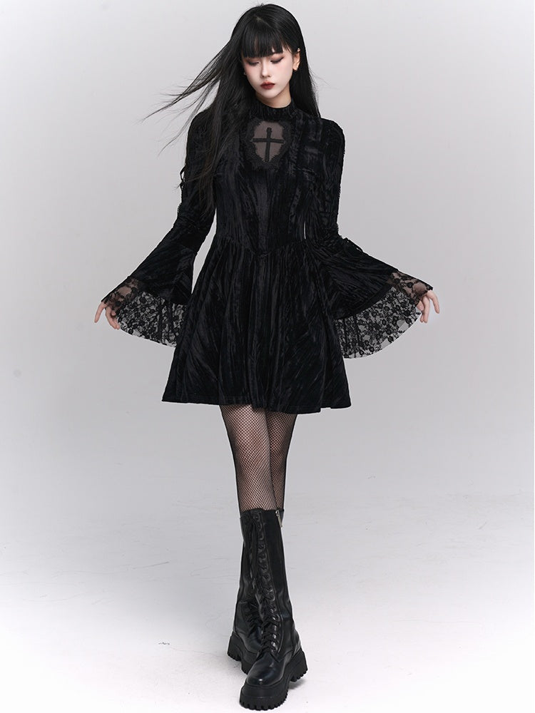 Black Gothic Cross Lace Trim Dress with Lace-up Detail at Bell Sleeves