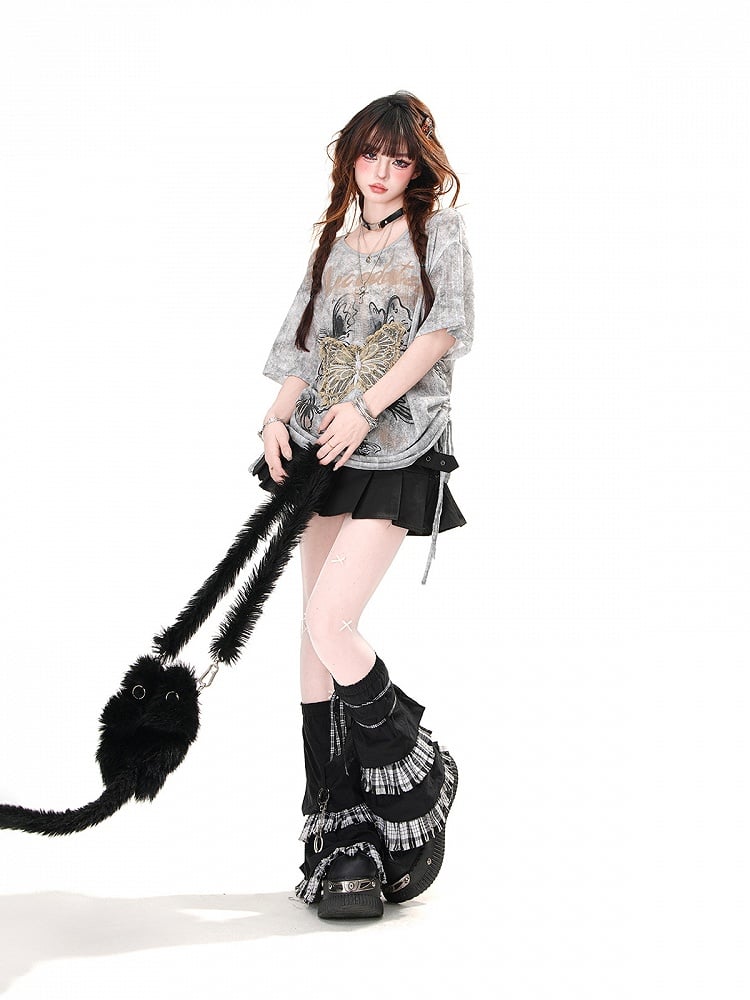Black/Gray Butterfly Applique and Print Drawstring Waist Loose T-Shirt