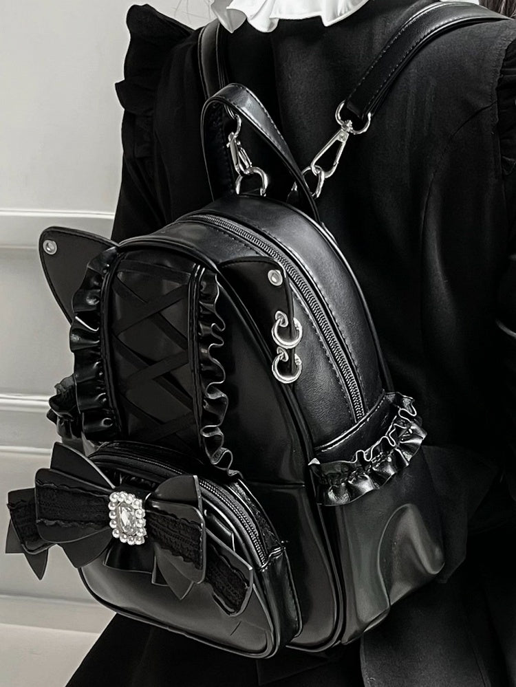 Jirai Kei Black Cat Ear Backpack With Beaded and Rhinestone Bow