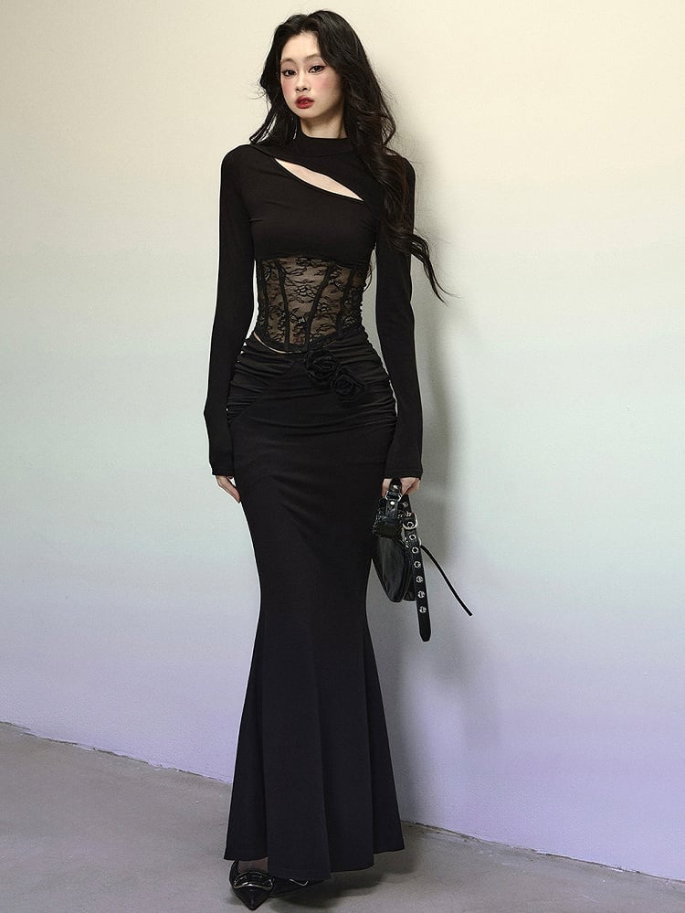 Black Lace Patchwork Cutout Detail Slim Fit Top
