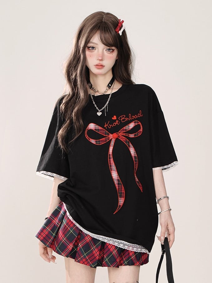Black Oversized Lace-Trim T-Shirt with Embroidered Lettering Plaid Bow Accent