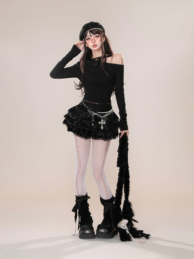 Black Pink Lace Trim Balletcore Tiered Skirt