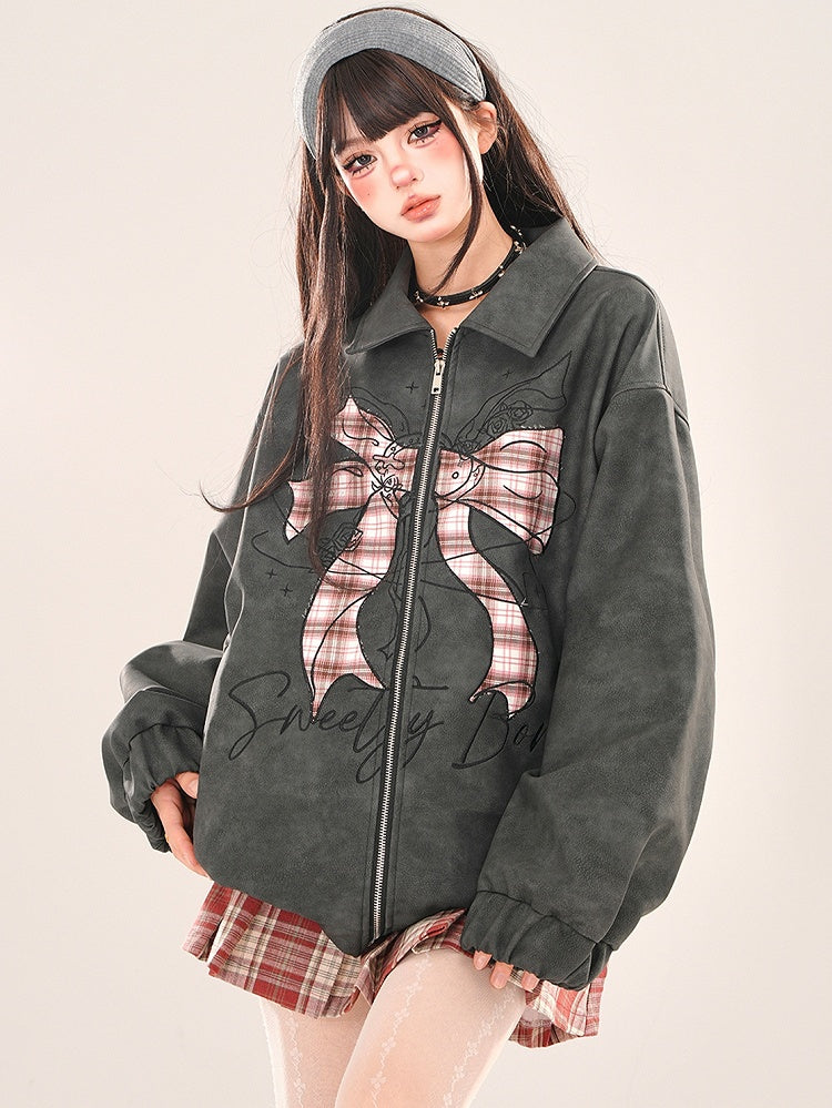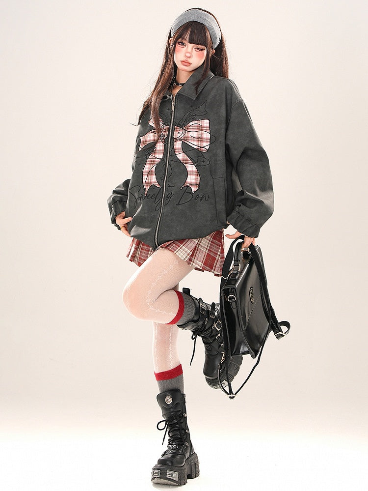 Black Plaid Bowknot Zip Placket Jacket