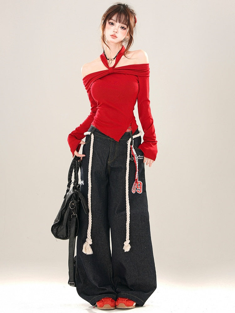 Black/Red Asymmetrical Slit Hem Halter Neck Top