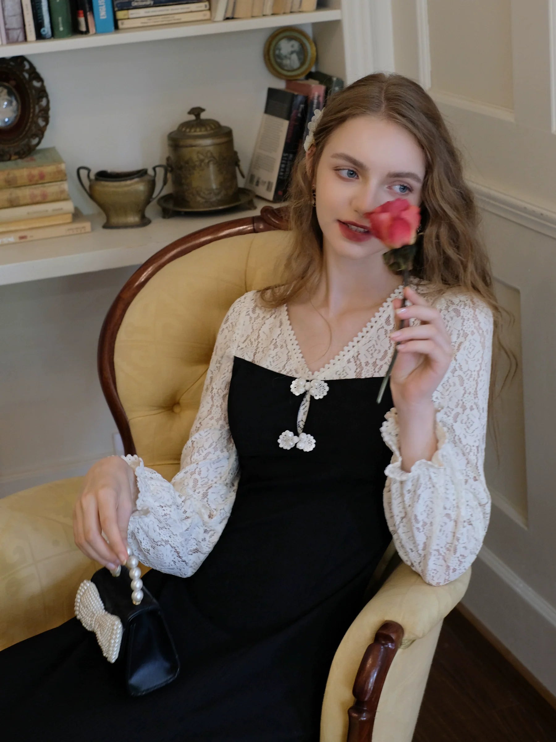 Elevate your style with this adorable Black Splicing China Lace Dress. The retro V-neck adds a touch of elegance, while the intricate lace design adds a touch of femininity. Perfect for any occasion, this dress will make you stand out in the crowd.