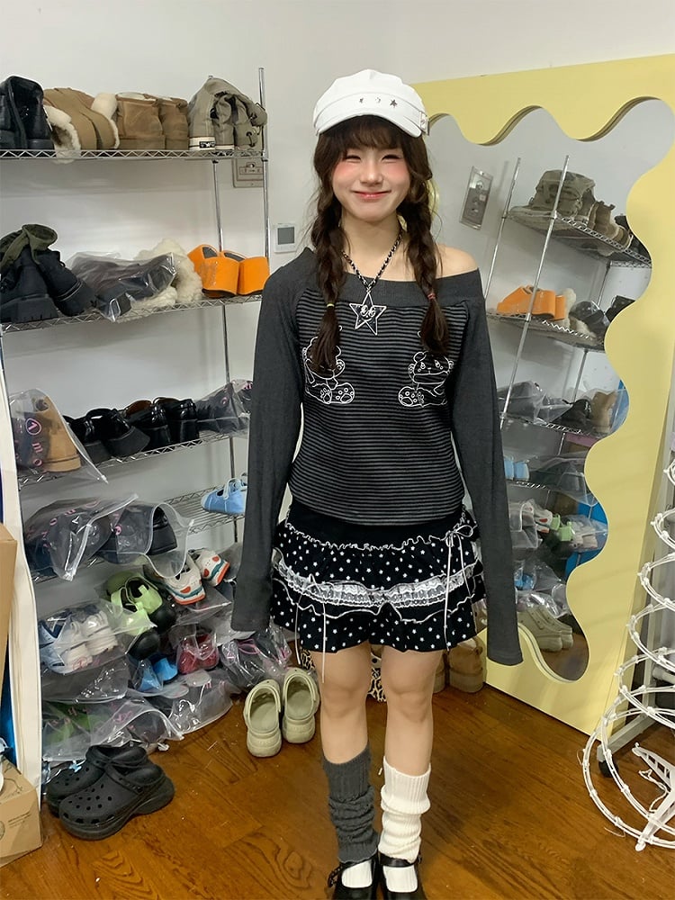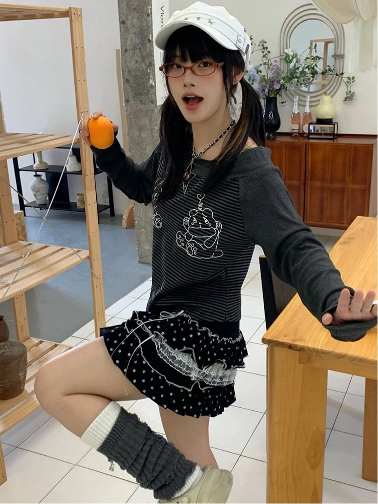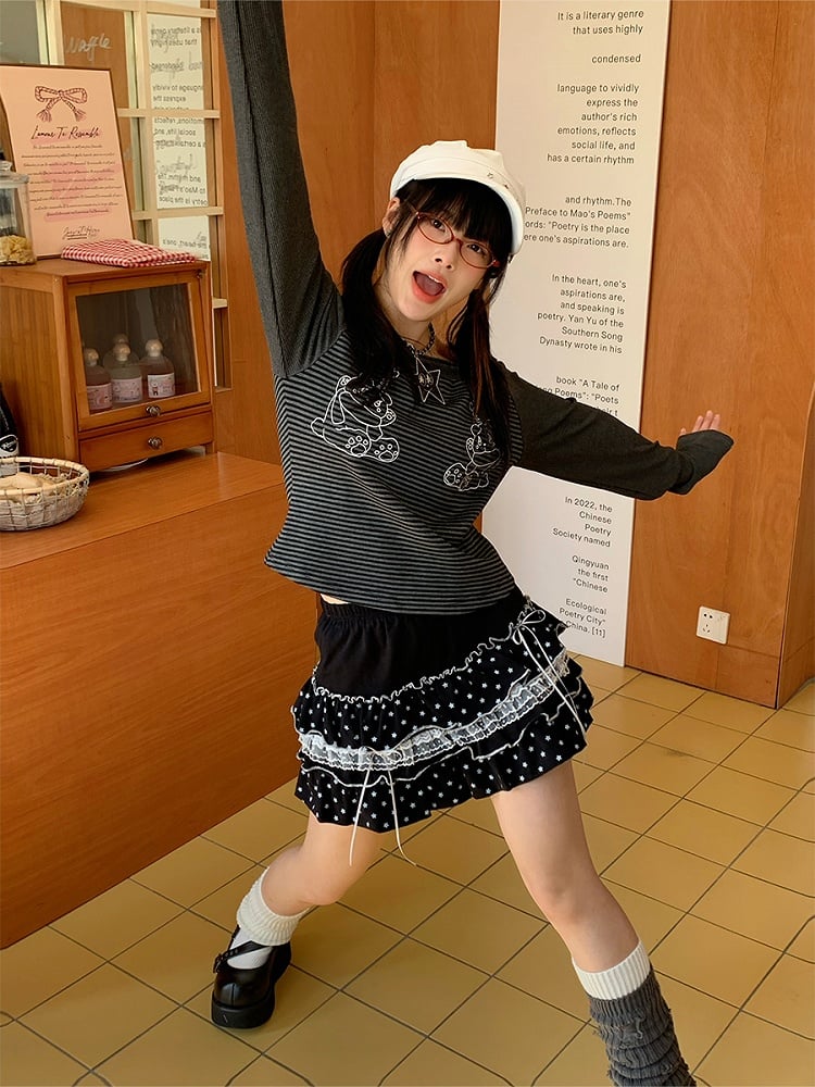 Black All-Over Star Print Tiered Skirt with Lace Trim and Bow