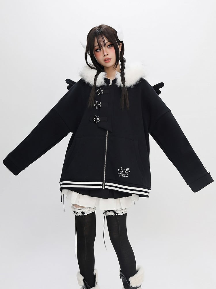 Bittersweet Black Hoodie Jacket with Star Clasps, Winged Back Design & Plush Fur-trimmed Hood