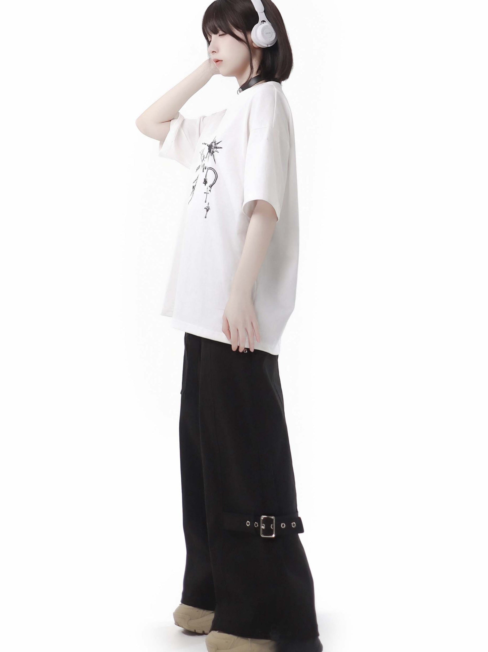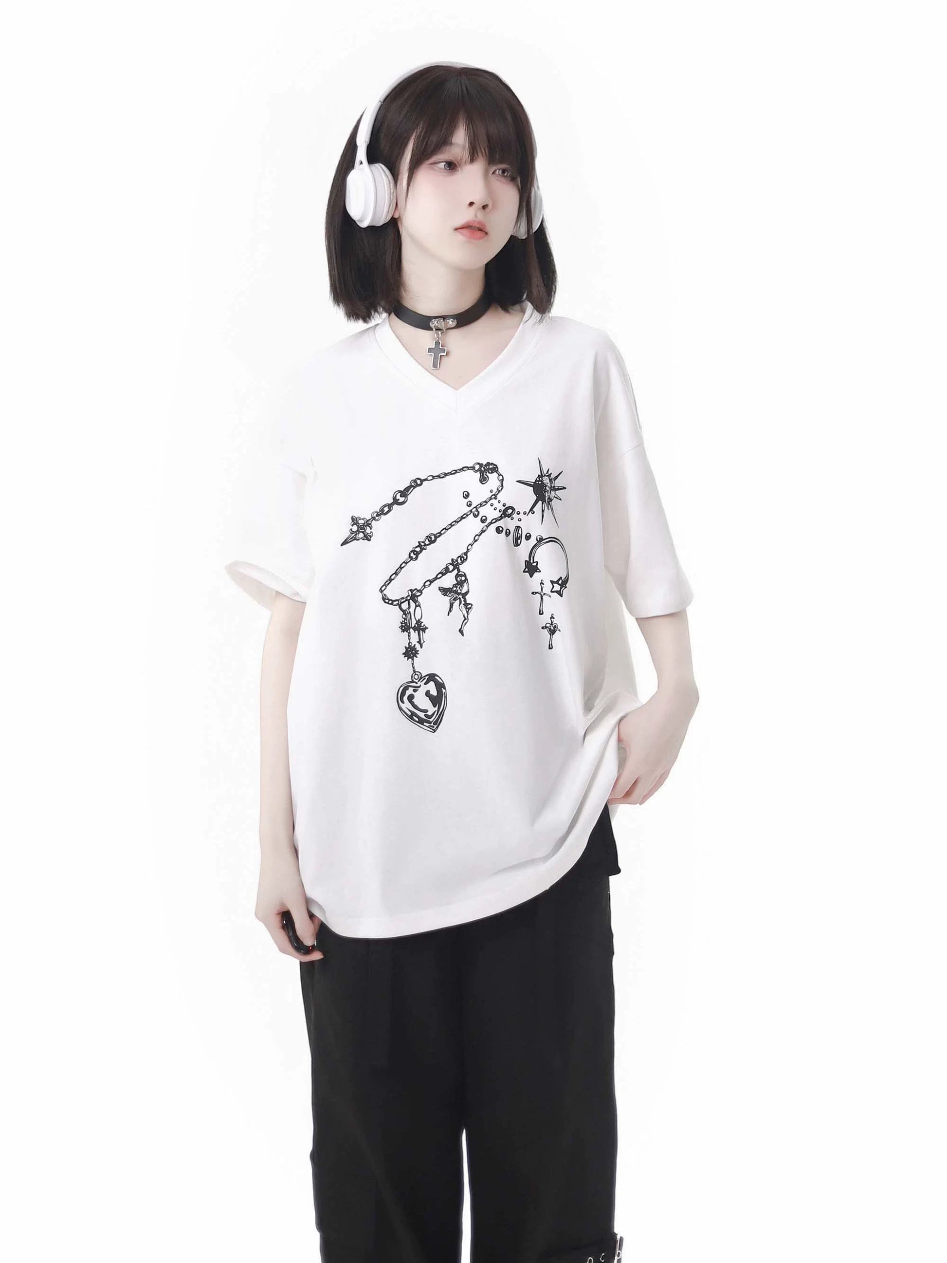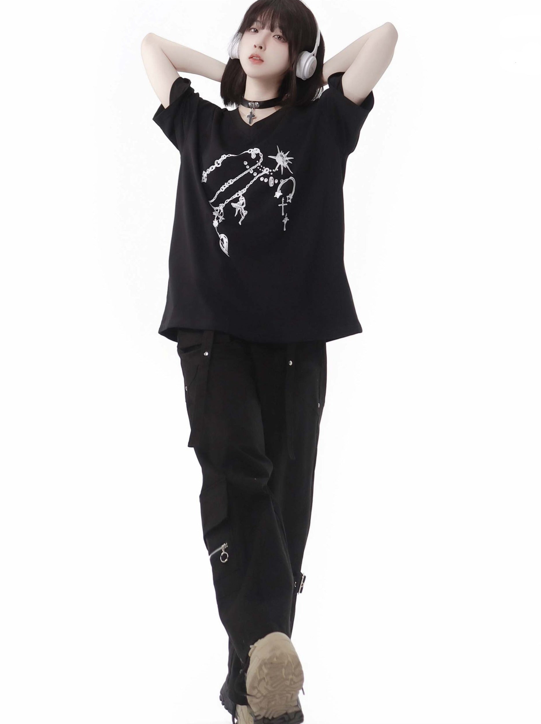 This black V-neck t-shirt features a stunning white gemstone print, adding a touch of charm to any outfit. Stay stylish and comfortable with this adorable piece.