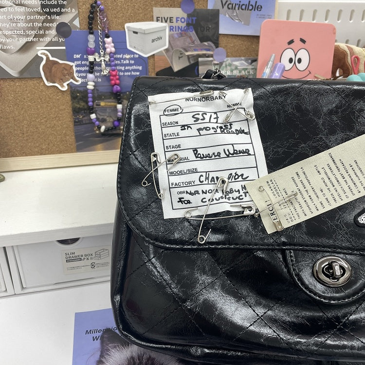 Black Vintage Motorcycle Shoulder Bag - Star-Studded with Oil Waxed Leather & Chain