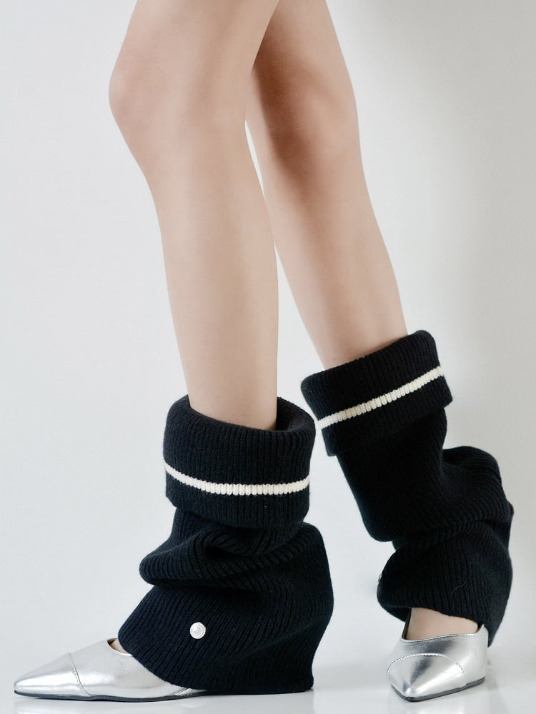 Black/White/Gray Cuffed Loose Knitted Leg Warmers with Metal Button Decoration