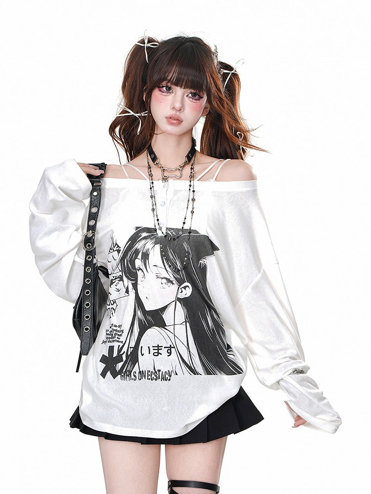 Black/White Off-the-shoulder Neckline Cartoon Print Top