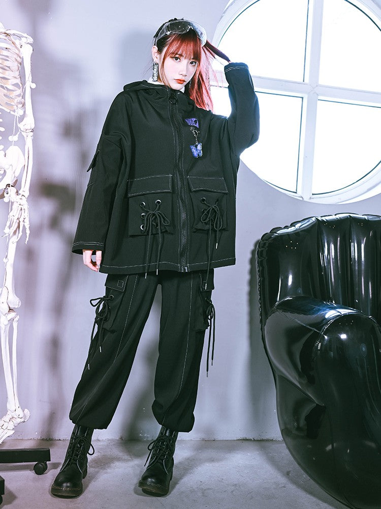 Black with Cargo Gothic Cheongsam Pants Cross-Tie Embroidery Butterfly Pockets
