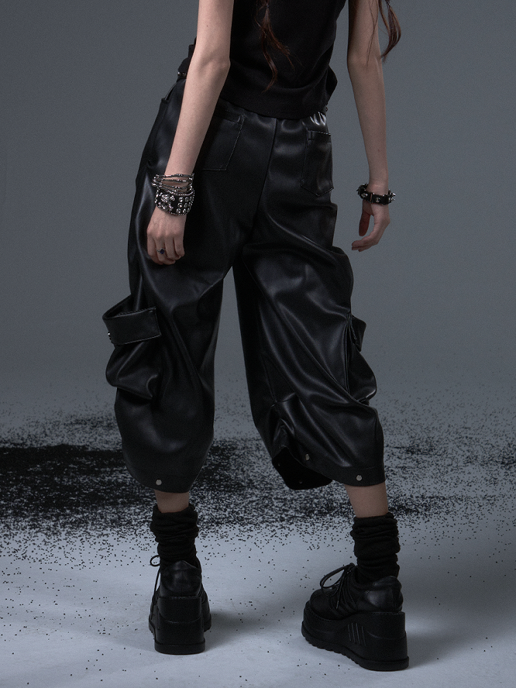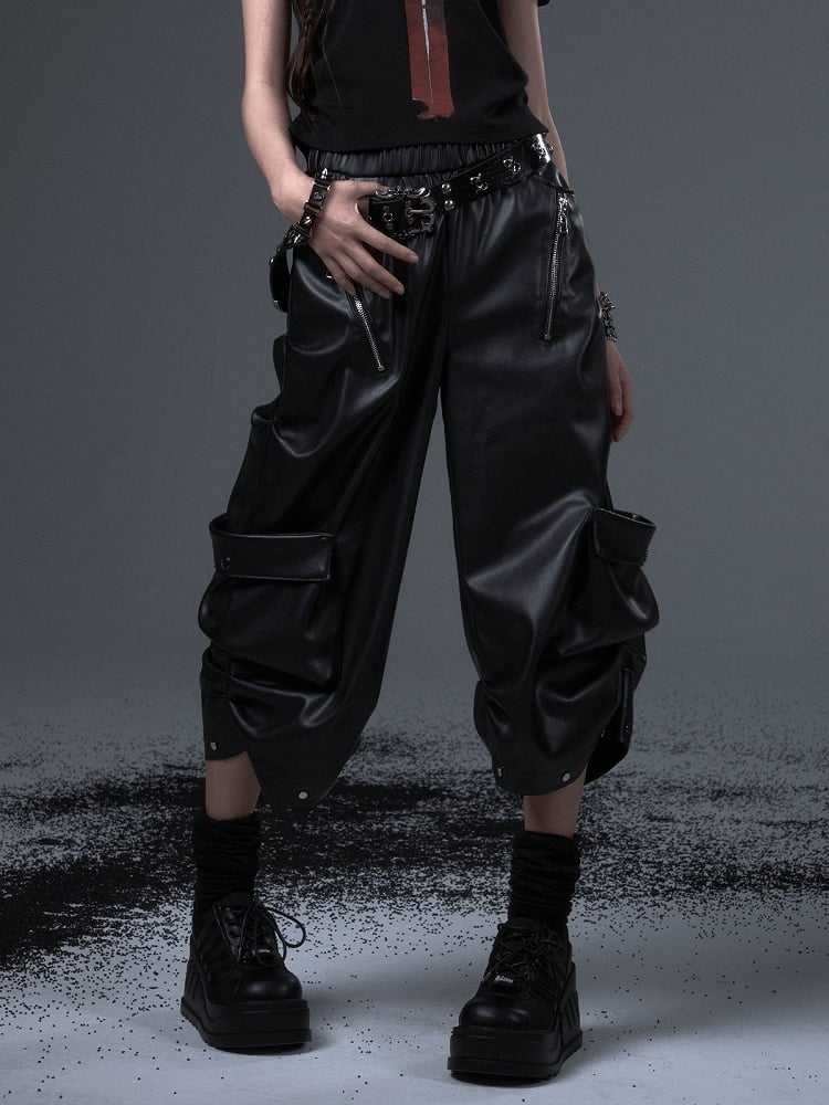 Black Punk Rock PU Wide-leg Mid-length Pants - Decorative Zipper, Studded Accents & Multiple Pocket Design