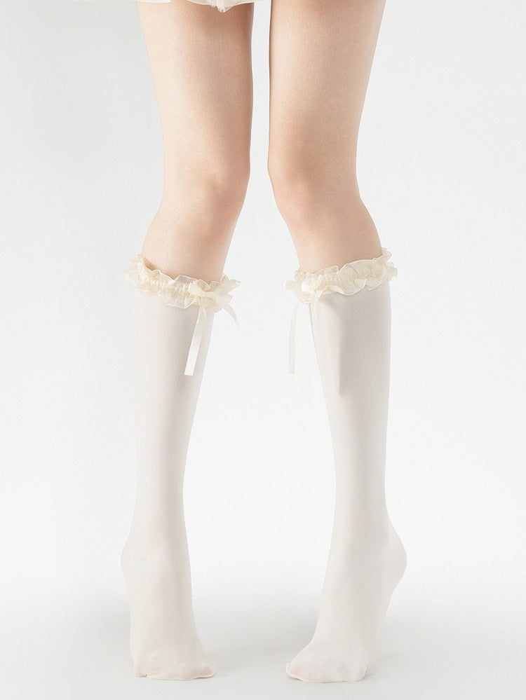 Black/Creamy Slimming White/White Calf Socks 40CM Trim Bow