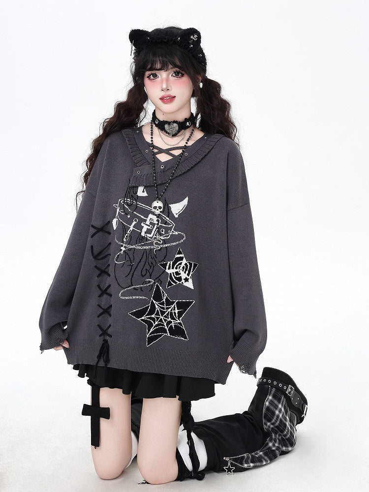 Gothic Black/Gray Lace-Up Sweater with Spiderweb Pentagram & Choker Print