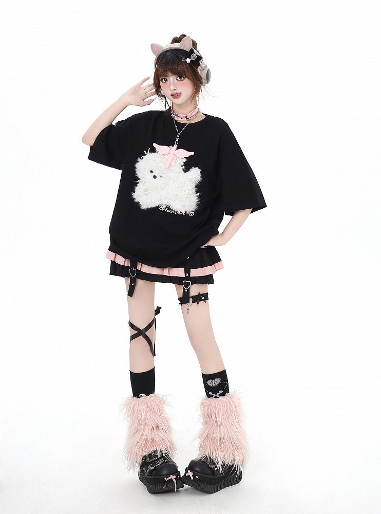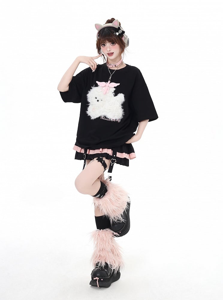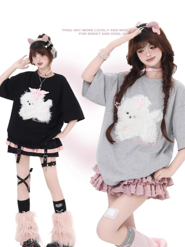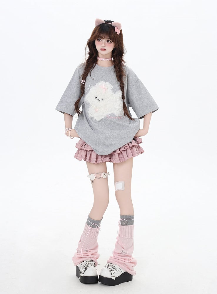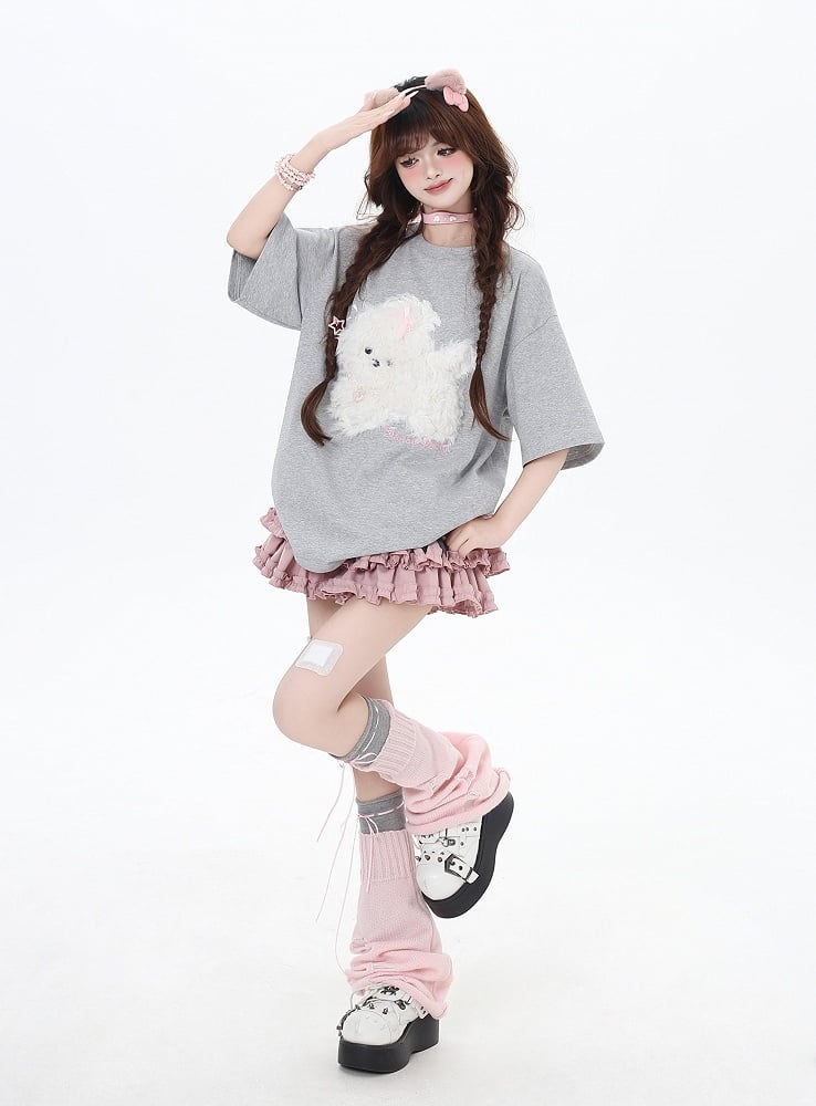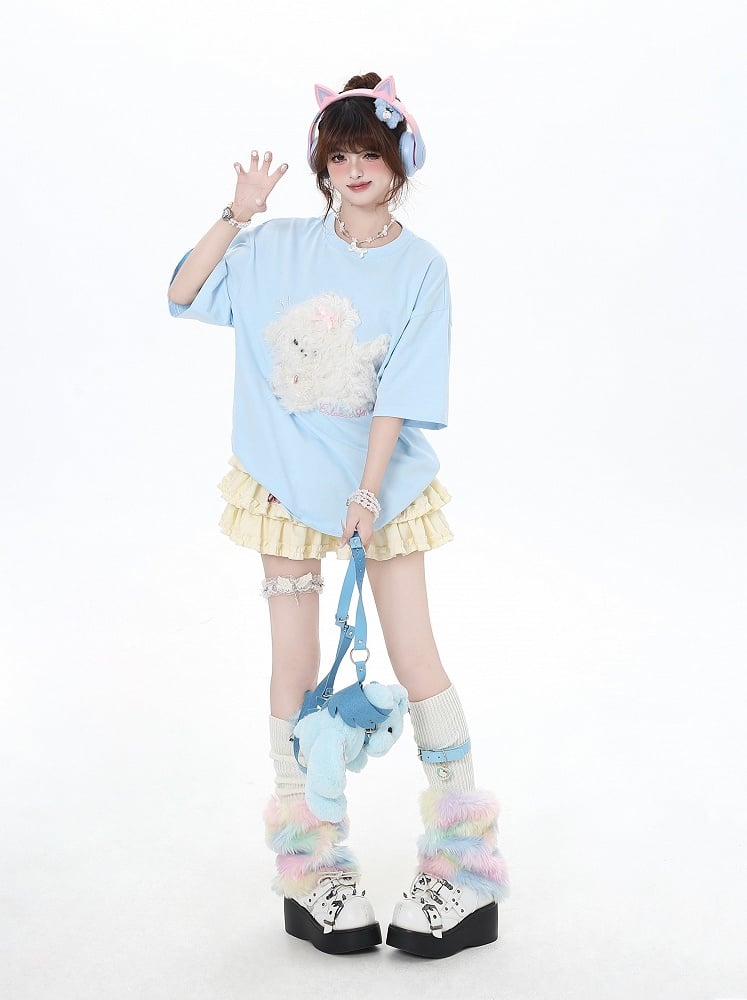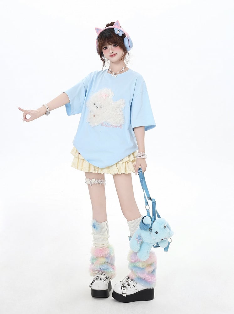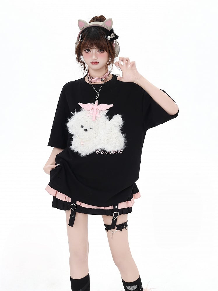 Black/Light Blue/Light Gray Plush Puppy Applique Loose T-Shirt