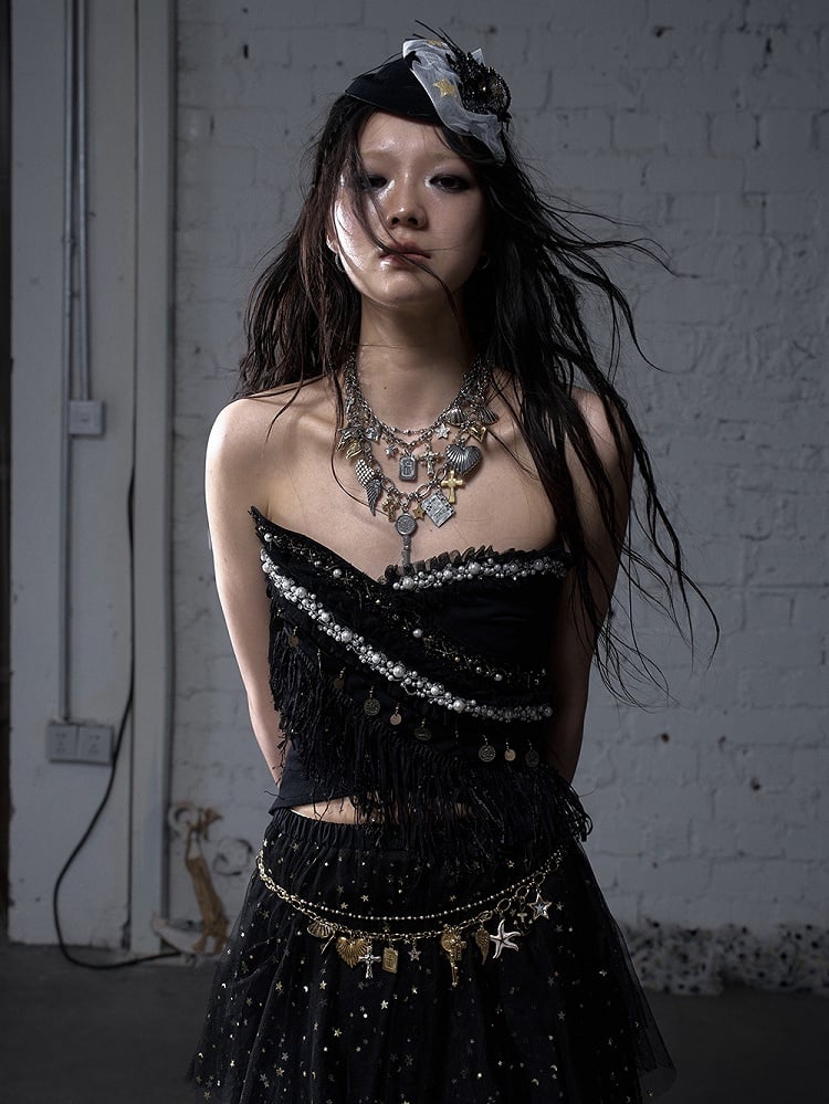 Baroque Bead Details Fringe Hem Black/White Crossover Design Strapless Top