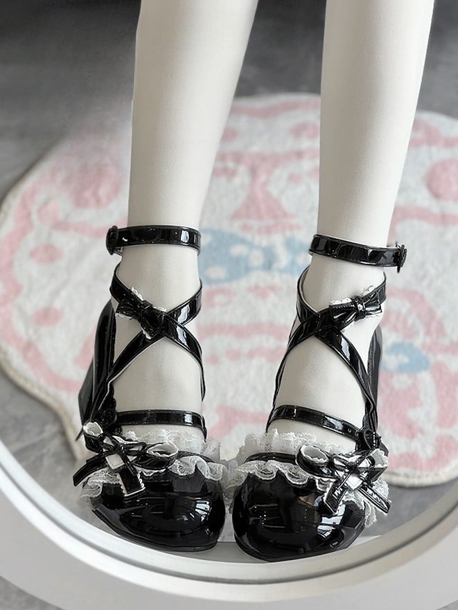 Mid Block Heel, Layered Lace & Bow Accents PU Leather Black Mary Janes