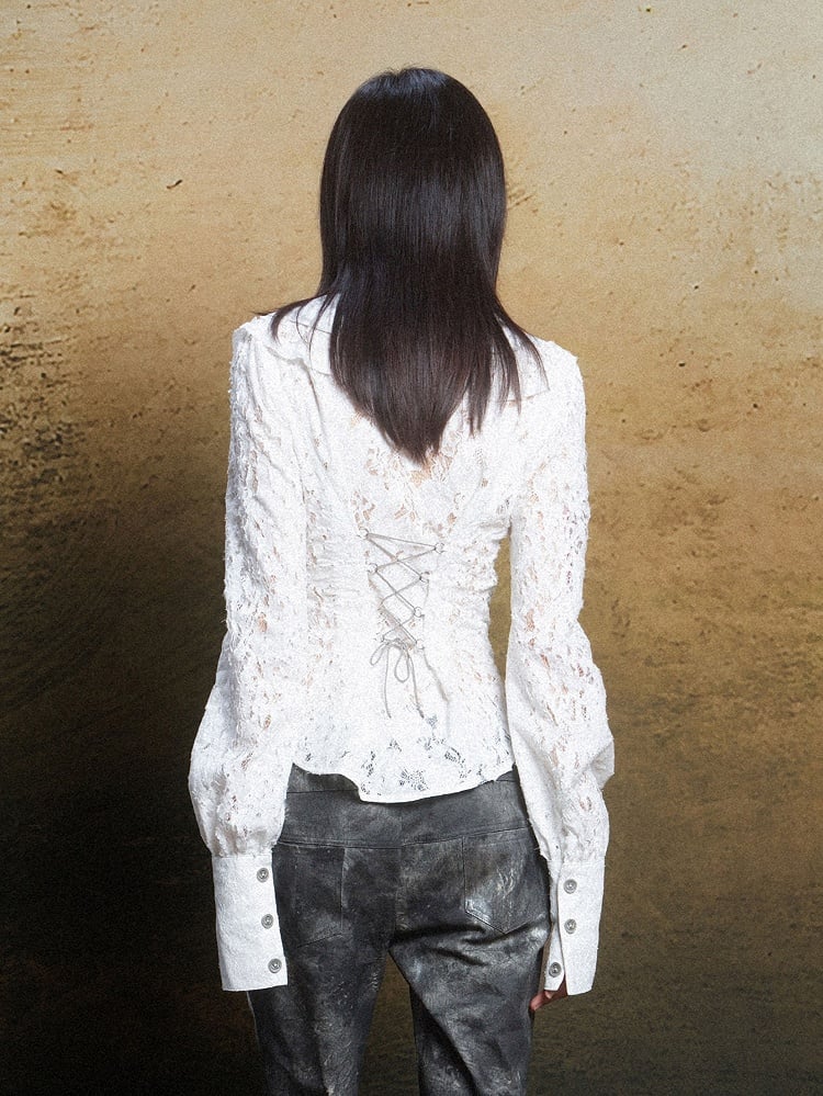 Blouse with Layered Lace-Up Detail Vintage Punk Collar White