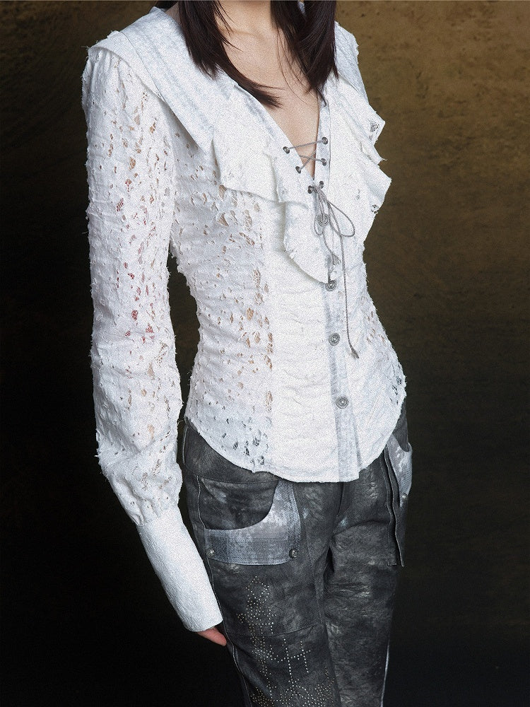 White Punk Vintage Blouse with Layered Collar & Lace-Up Detail