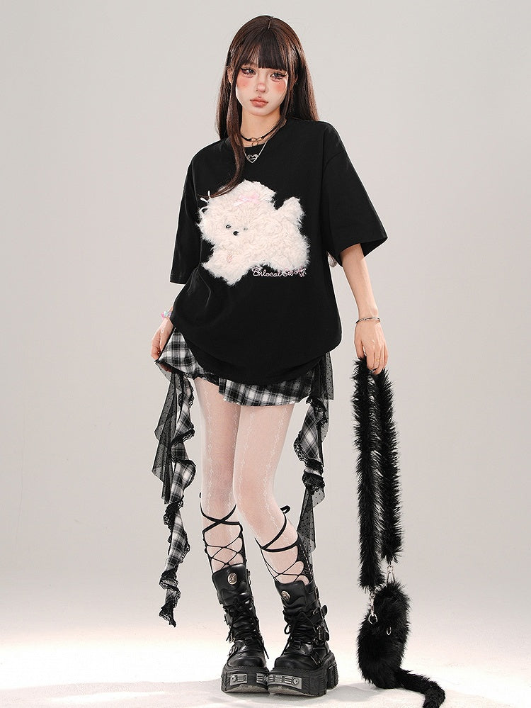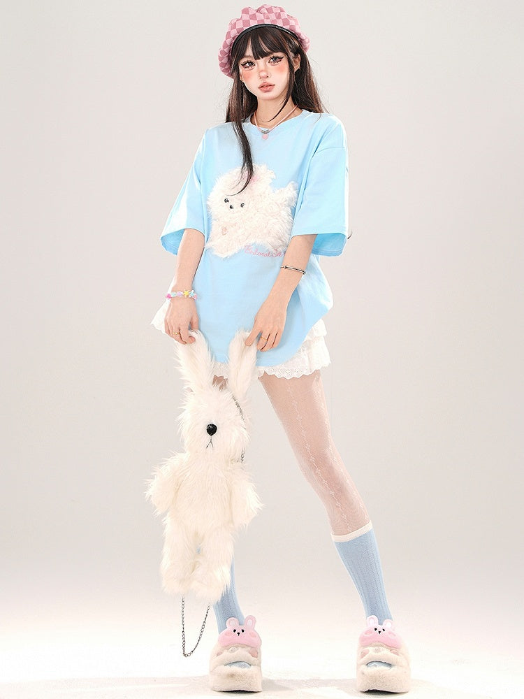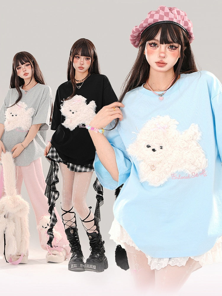 Blue/Grey/Black Plush Puppy Applique Loose T-shirt