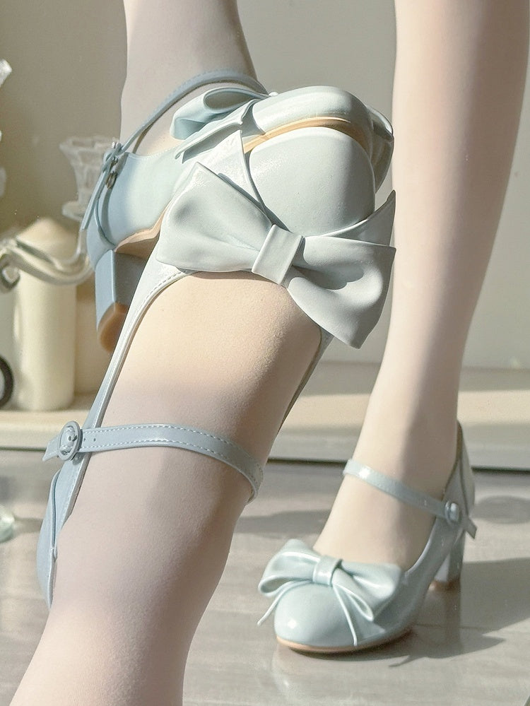 Blue Mid Block Heel Mary Janes in Classic Lolita with Bow at Top & Round Buckle