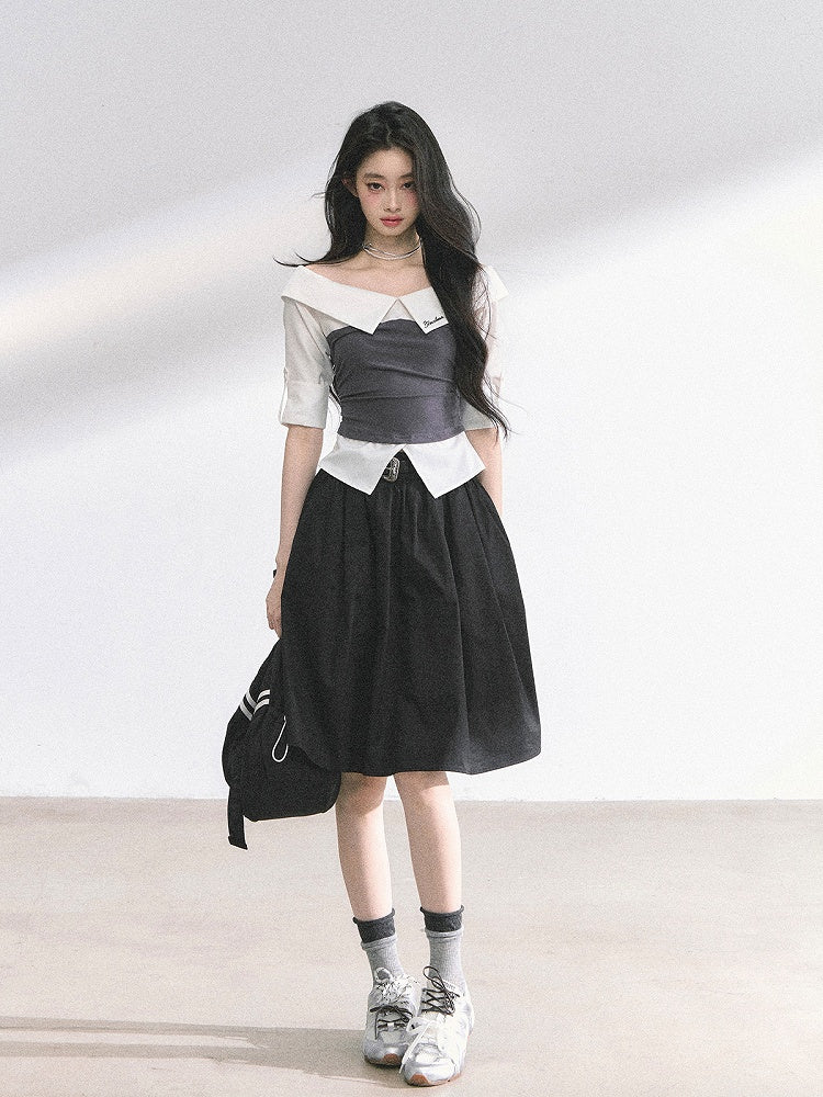 Off-the-shoulder Neckline Foldover Collar Gray/Navy Blue Striped Shirt