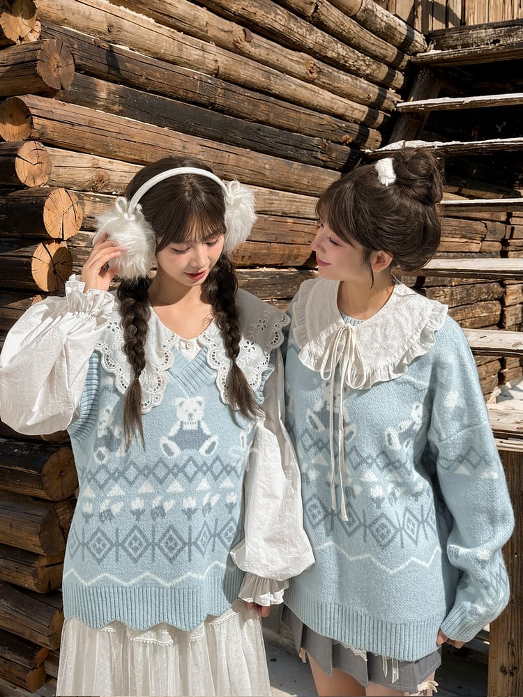 This adorable vest features a cute blue teddy bear pattern and scalloped edge trim, adding a touch of sweetness to your outfit. Stay stylish and cozy with this lovely addition to your wardrobe.