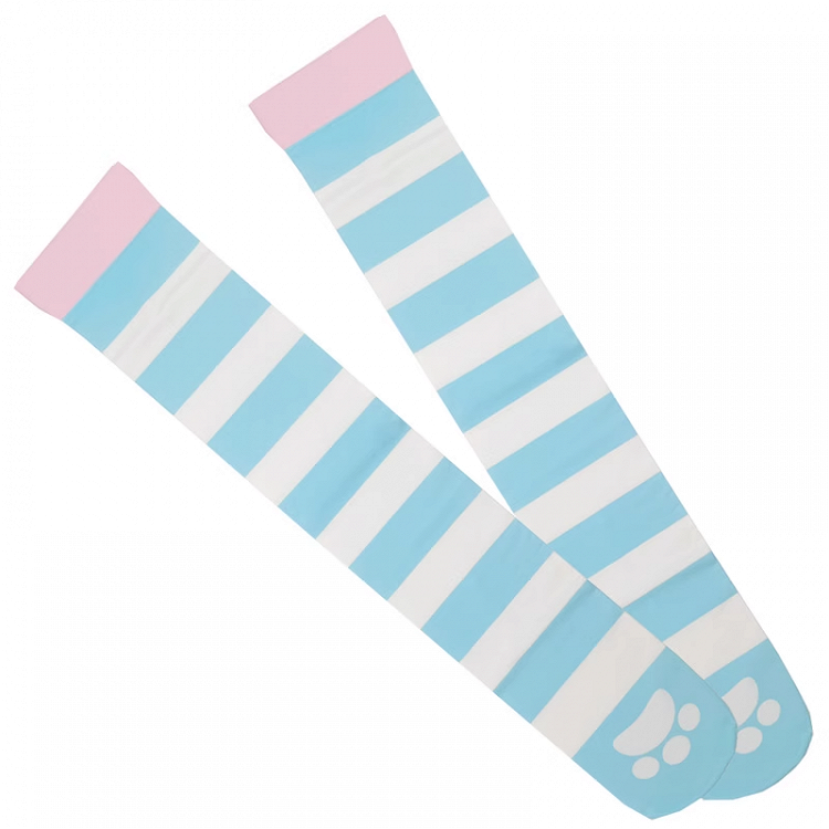Blue & White Striped Cat Paw Pattern Over Knee Stockings