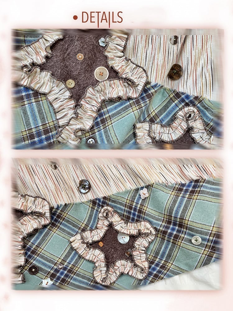 Bohemian Mori Kei Midi Skirt: Vintage Beige & Green Plaid Patchwork with Star Appliques