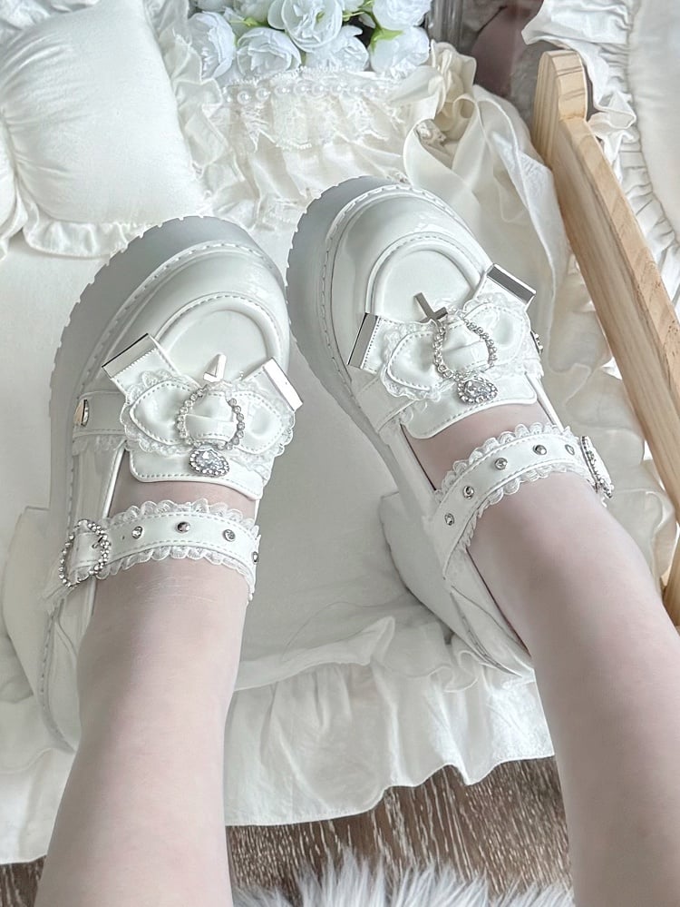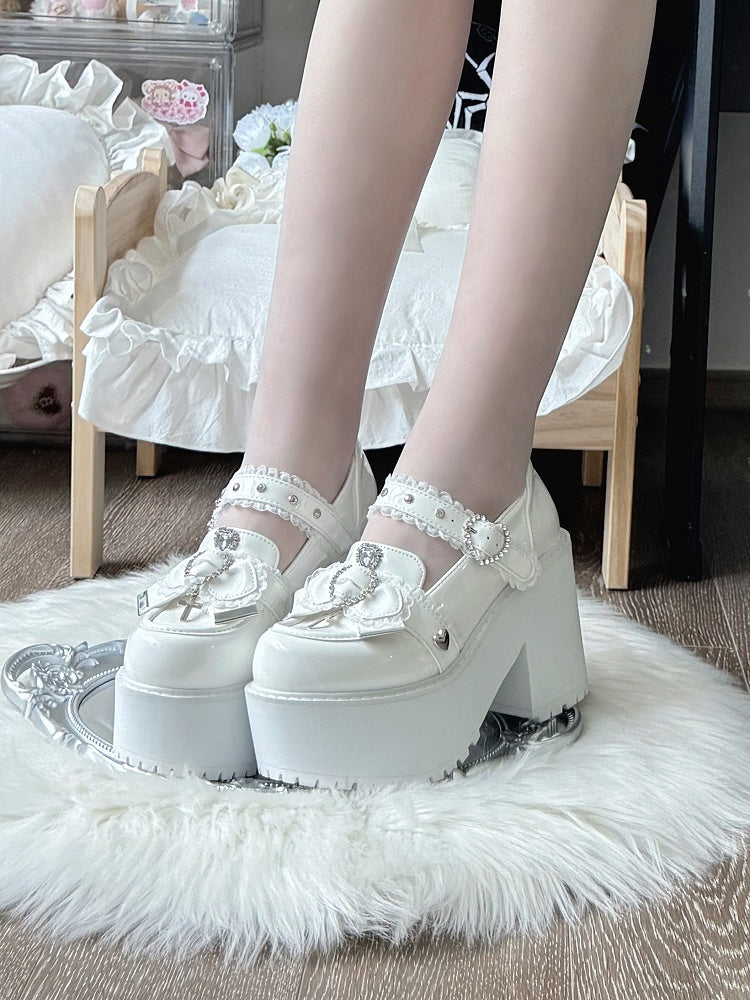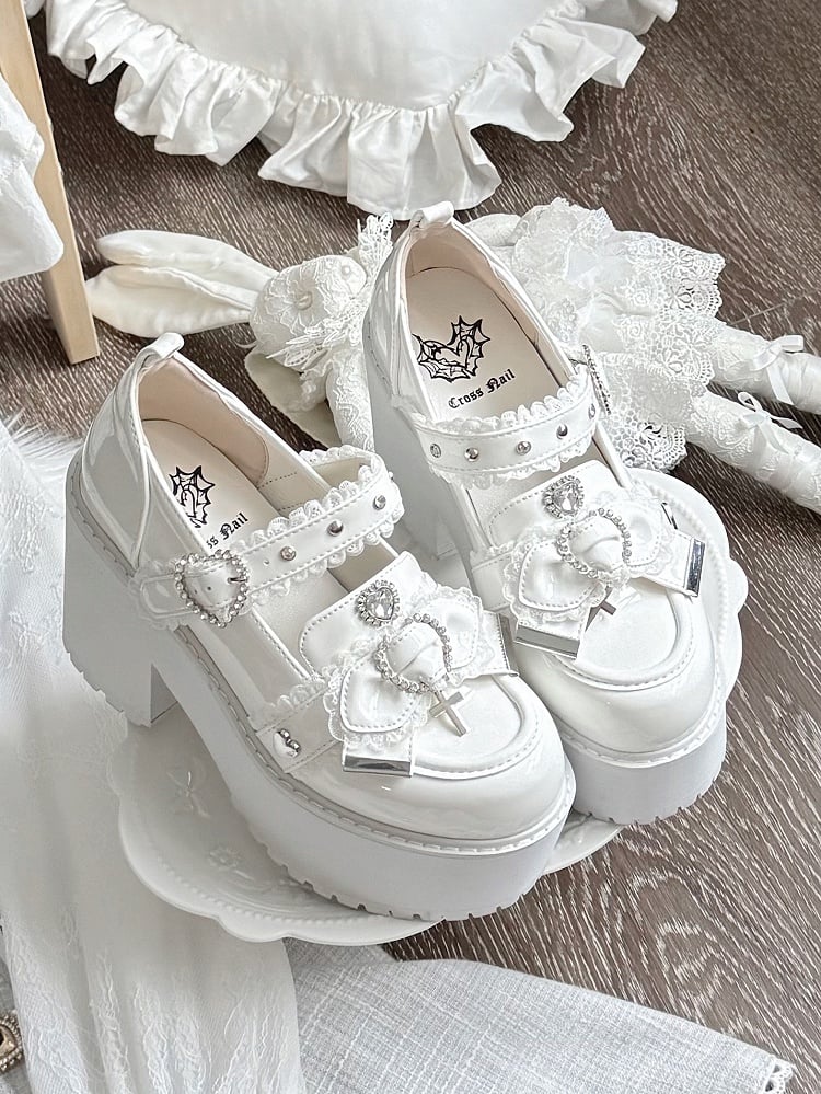 Bow, Cross Charm & Heart Rhinestone Detail | White Jirai Kei Chunky Heel Mary Janes with Lace Edging