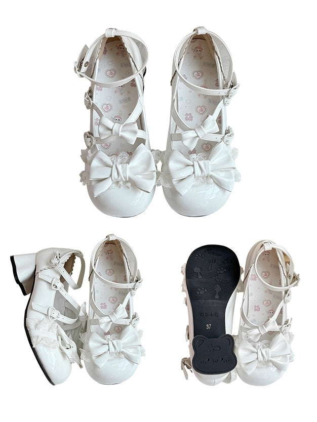 Bow Crisscross Heels White in Sweet Mid Cat with Straps Accents Lolita Heel