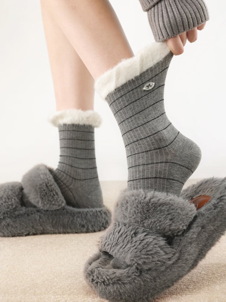 4 Colors Striped Pattern Plush Cuff Cotton Socks with Bow-Patterned Button Accents