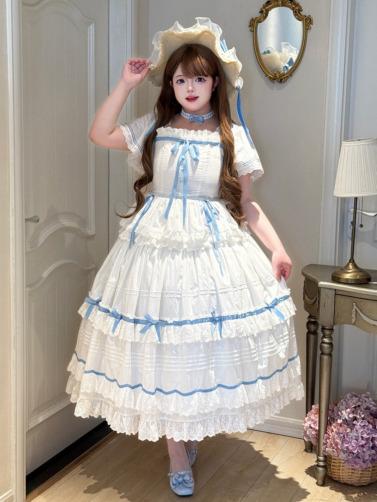Blue and White Old School Lolita Fashion Dress Bowknot Detais JSK Set
