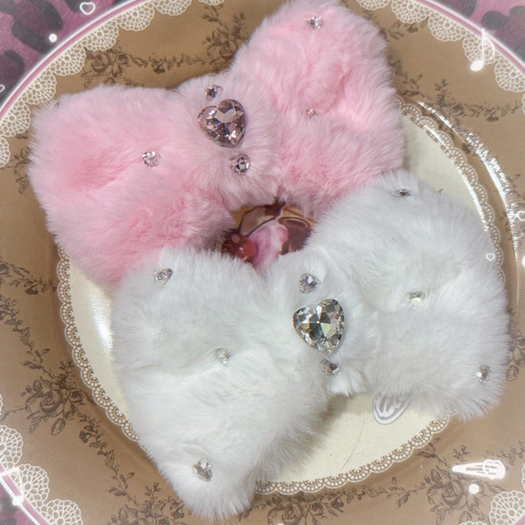 Bowknot Decoration Plush Pink/White with Gemstone Hairclip