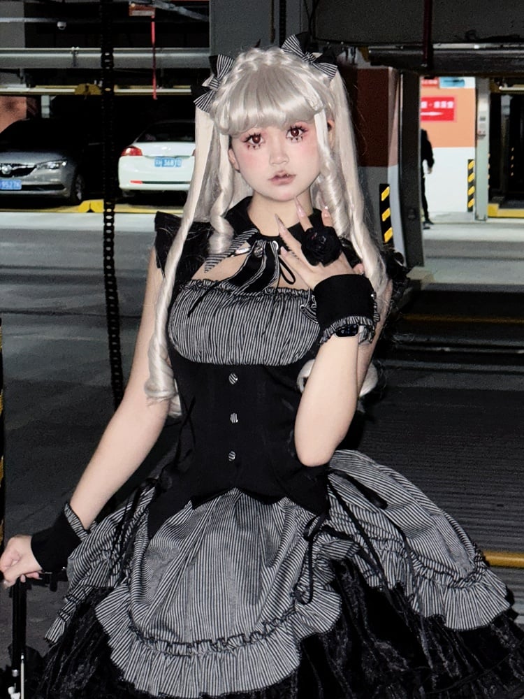 Black and White Old School Lolita Fashion Dress Bowknot Lolita JSK Set