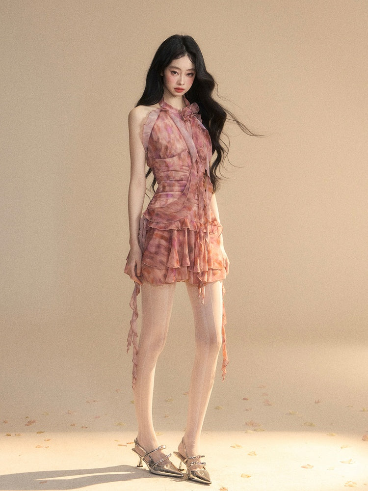 Brick Red Halter Neck Ruffled Hem Tiered Skirt Glamorous Dress