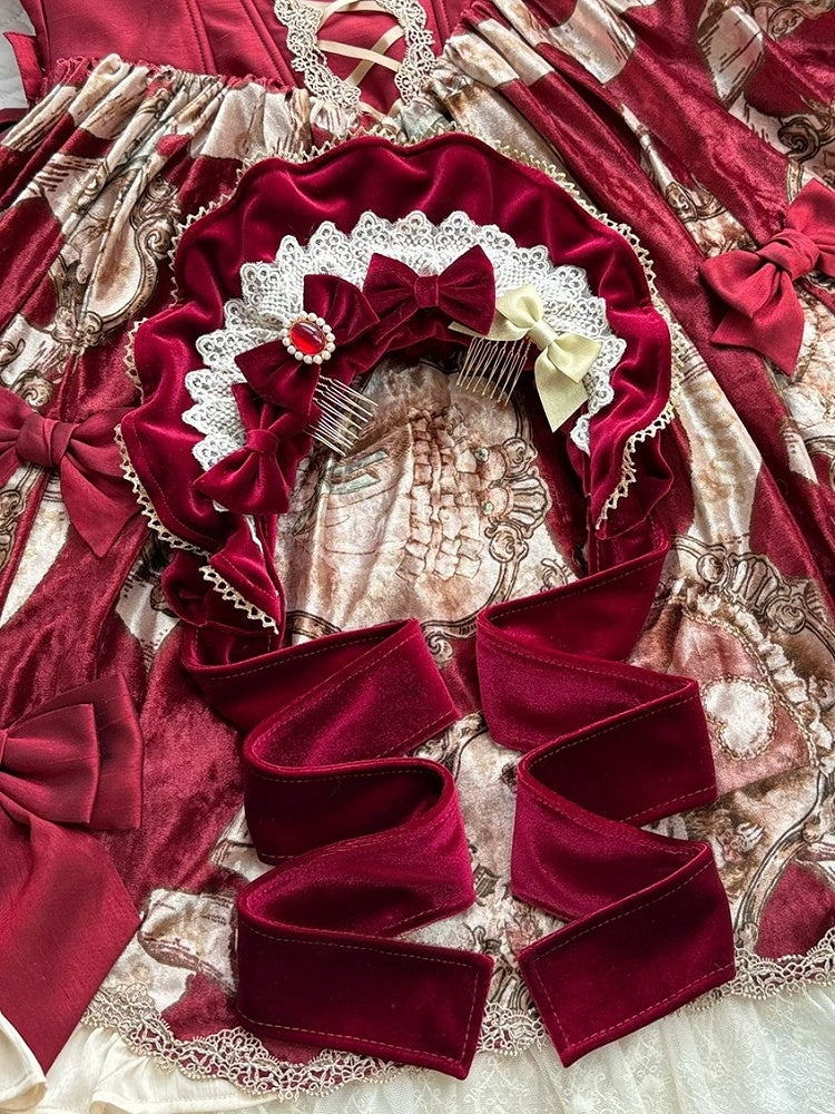 Wine Red/Black Velvet Lace Trim Bonnet + 4 Bowknot Brooches