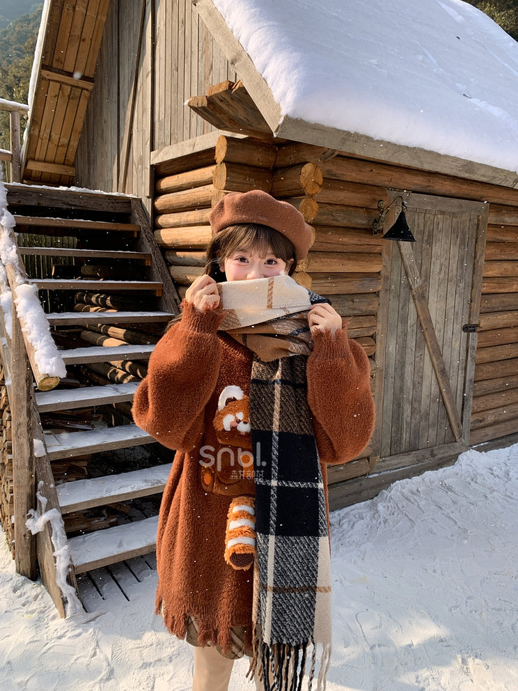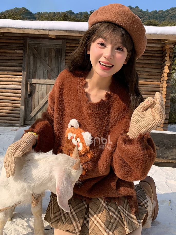 Brown Cute Red Panda Adorned Distress Trim Loose Sweater