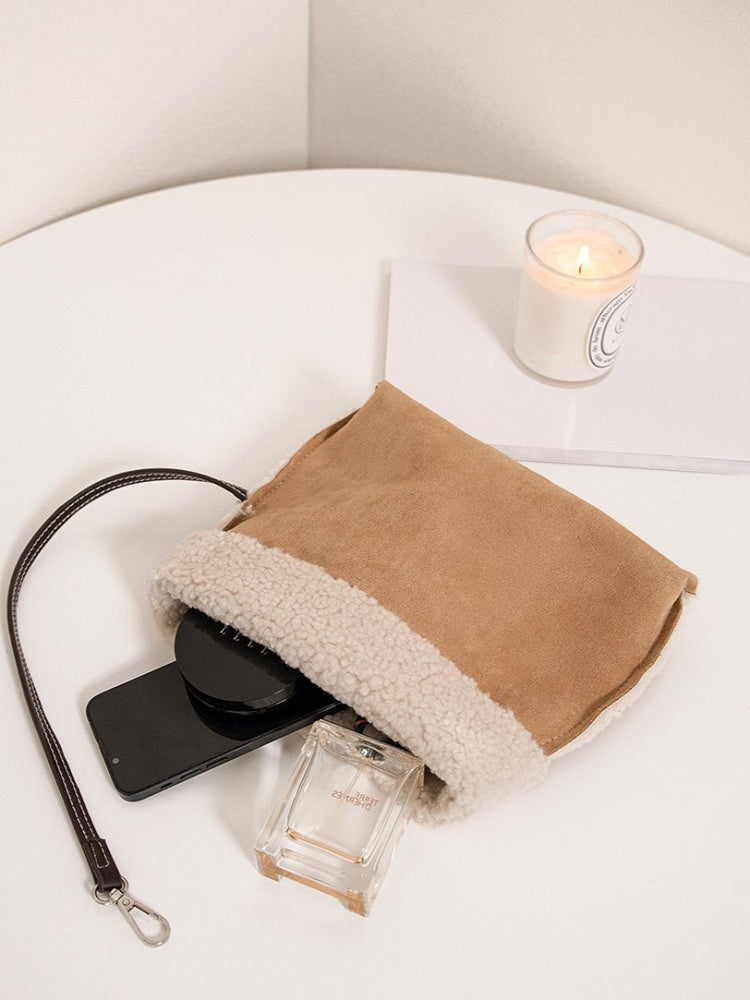 Plush Trim Brown Tote Bag With Vintage Bamboo Knot Accents - Large Capacity Shoulder Bag For Fall And Winter