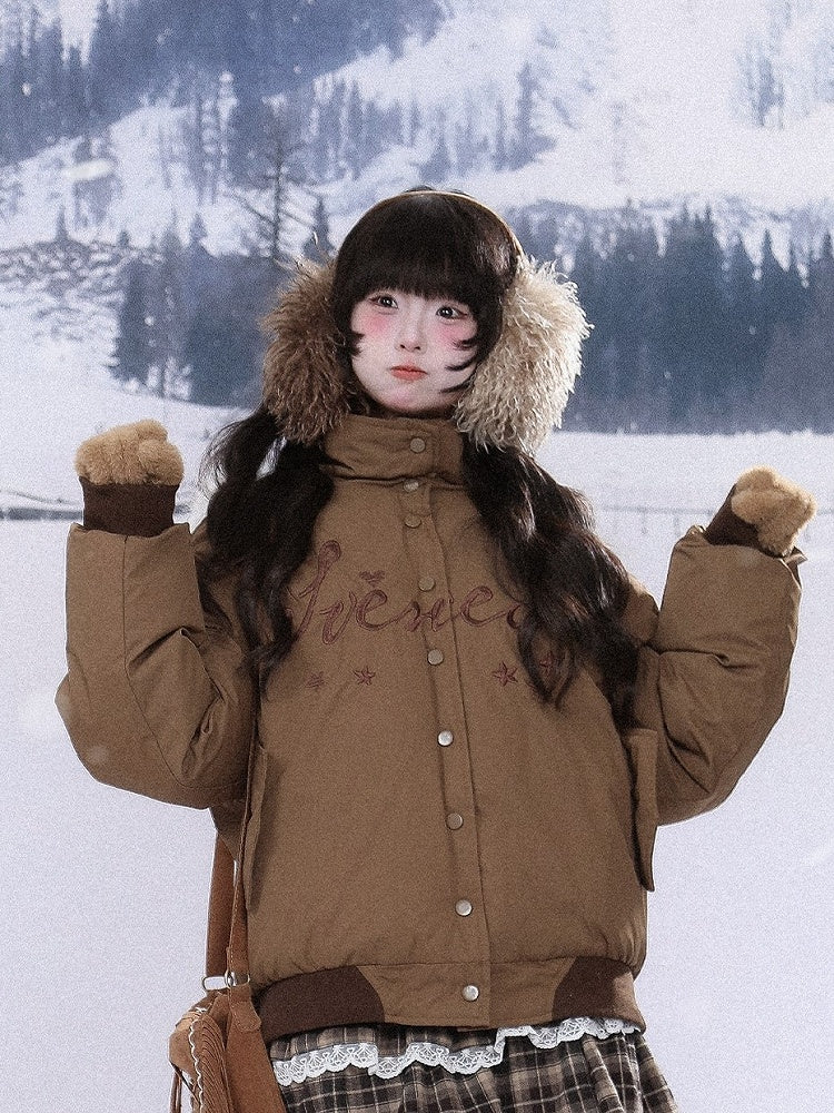 Daily Kawaii Blouson Jacket in Brown/Blue with Star Embroidery & Dual Closure