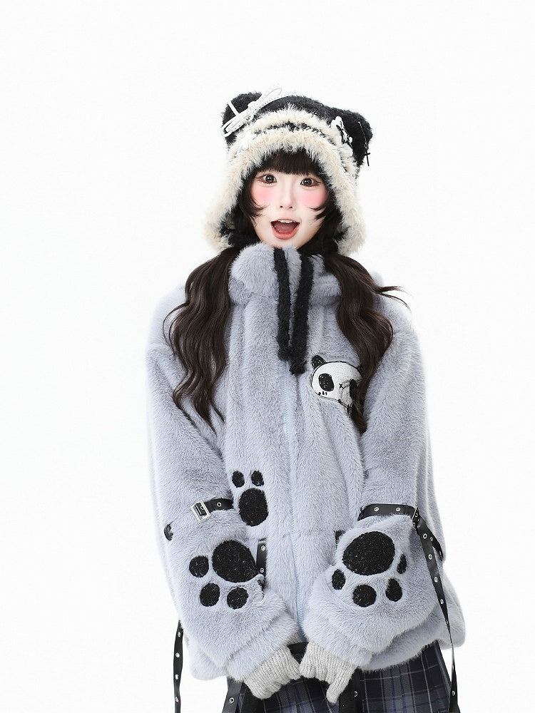Grey/Grey Blue Bittersweet Plush Hoodie Jacket - Decorative Buckle Straps, Bear Paw Embroidery & Bear Ear Hood