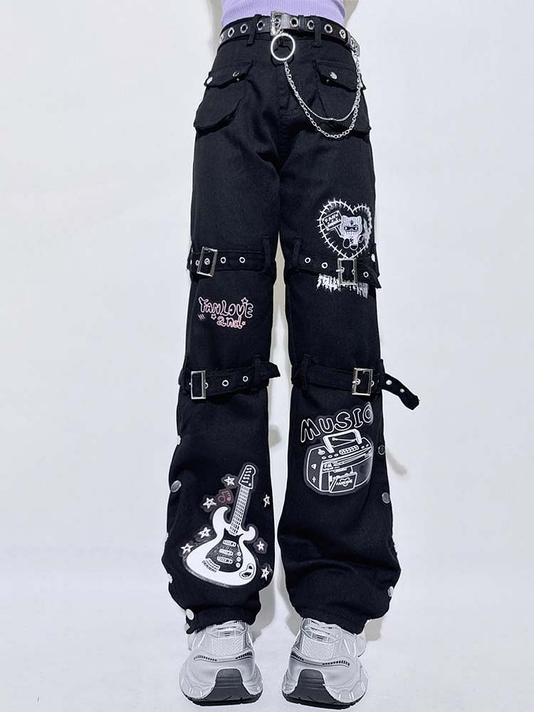 Black Punk Straight-leg Pants with Buckle Straps and Guitar Print