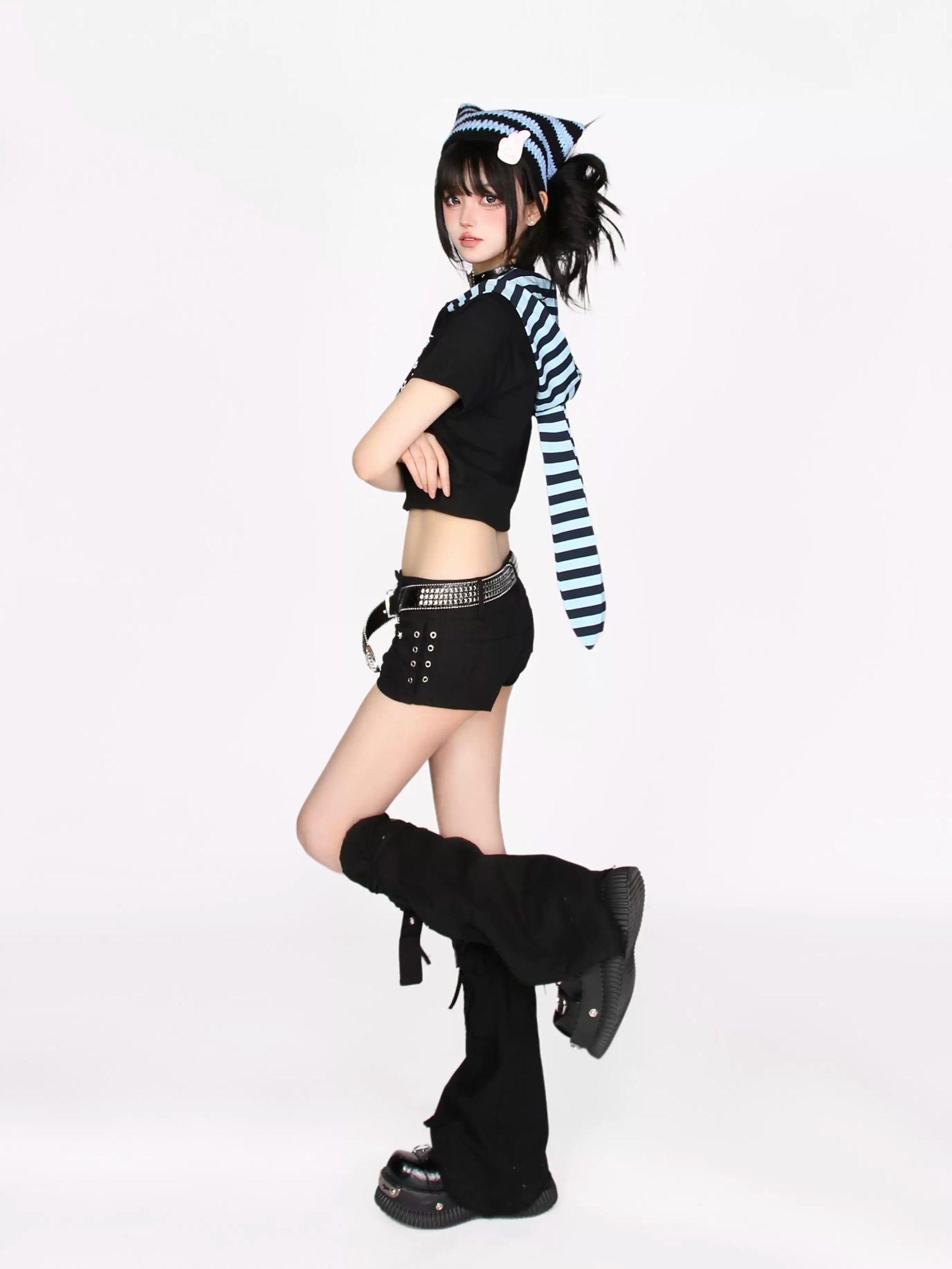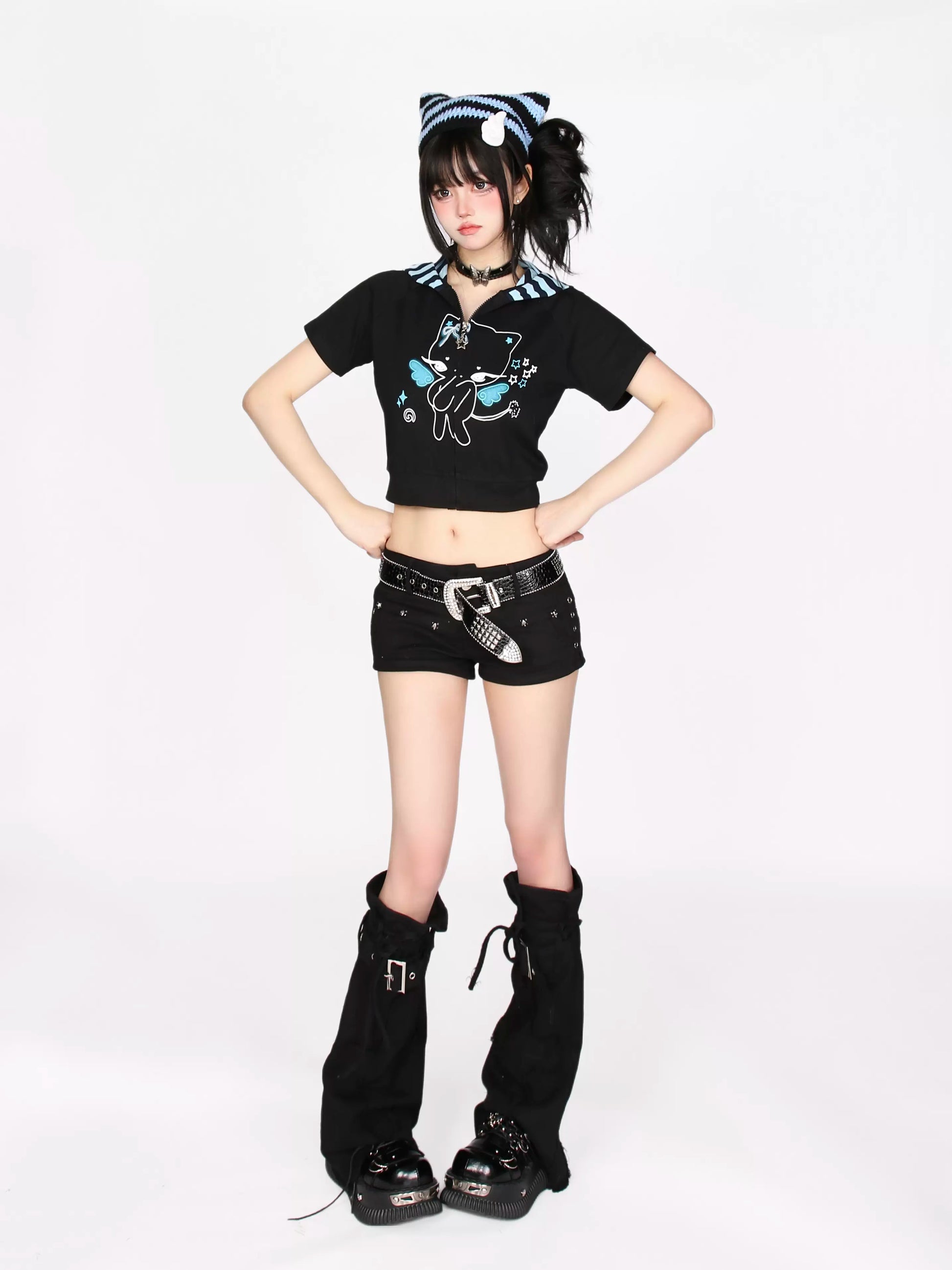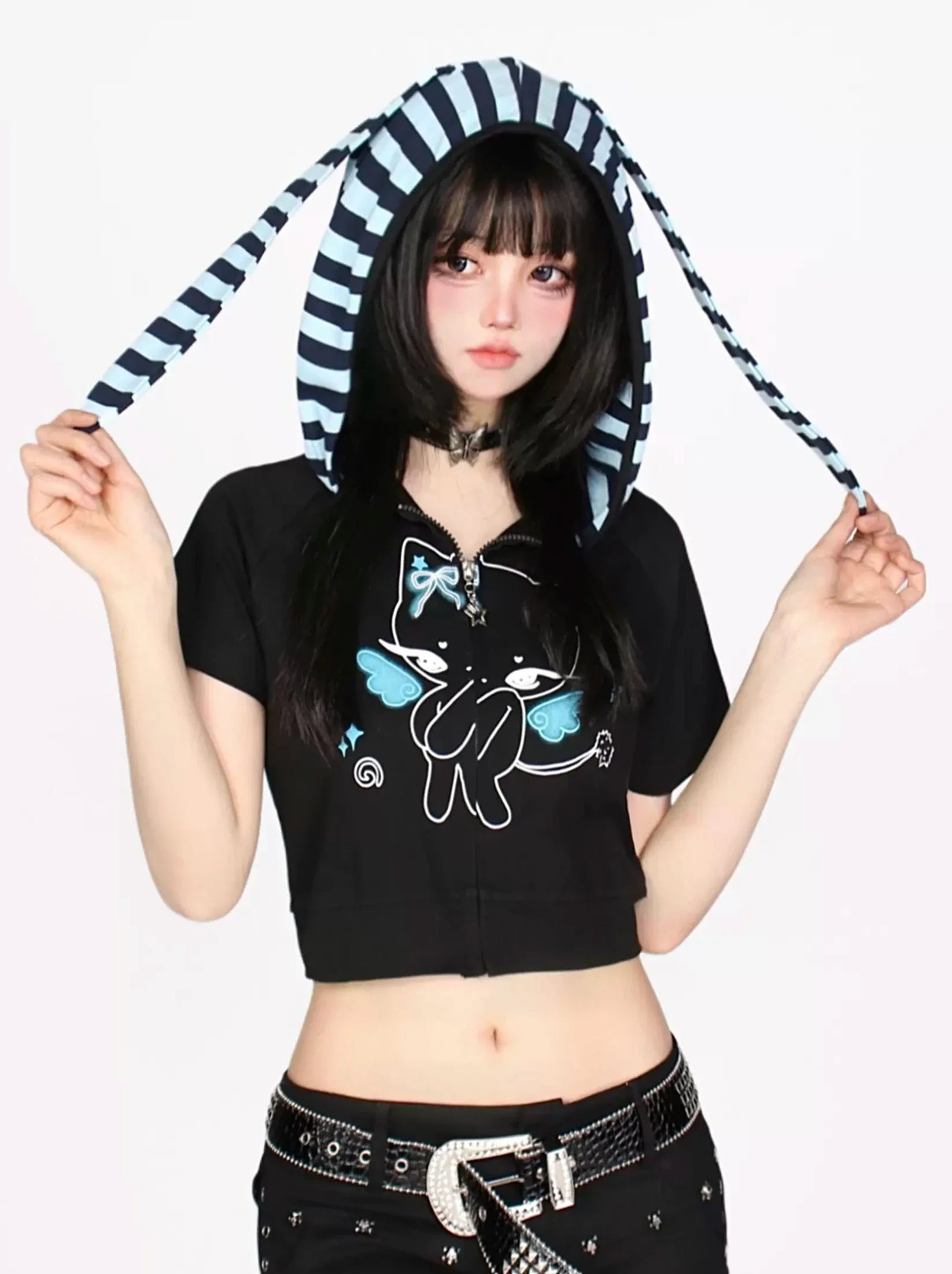 Bunny Print Short Angel Hoodie Zip Ears Cat T-Shirt