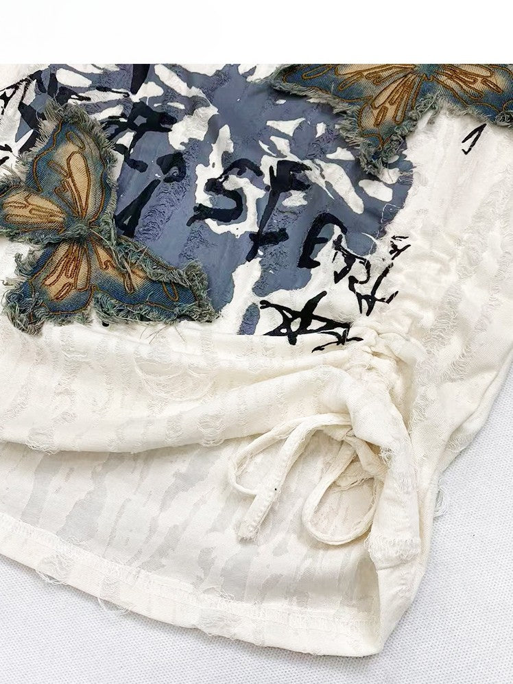Butterfly Bittersweet Neckline Kawaii T-shirt Asymmetrical Applique White