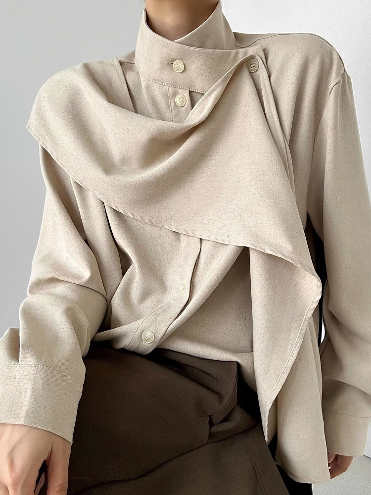 Khaki Long Sleeve Extended Stand Collar Unisex Shirt with Button Cuffs & Convertible Scarf
