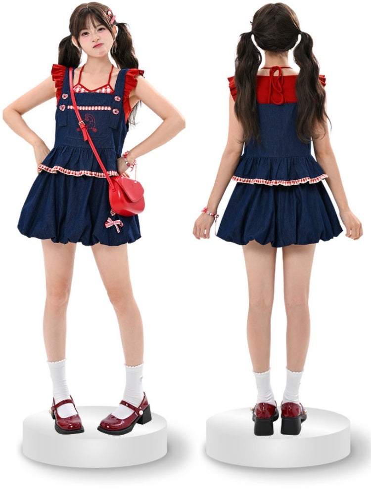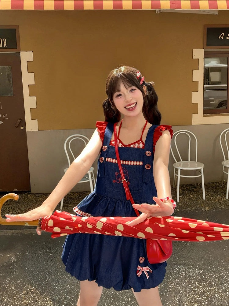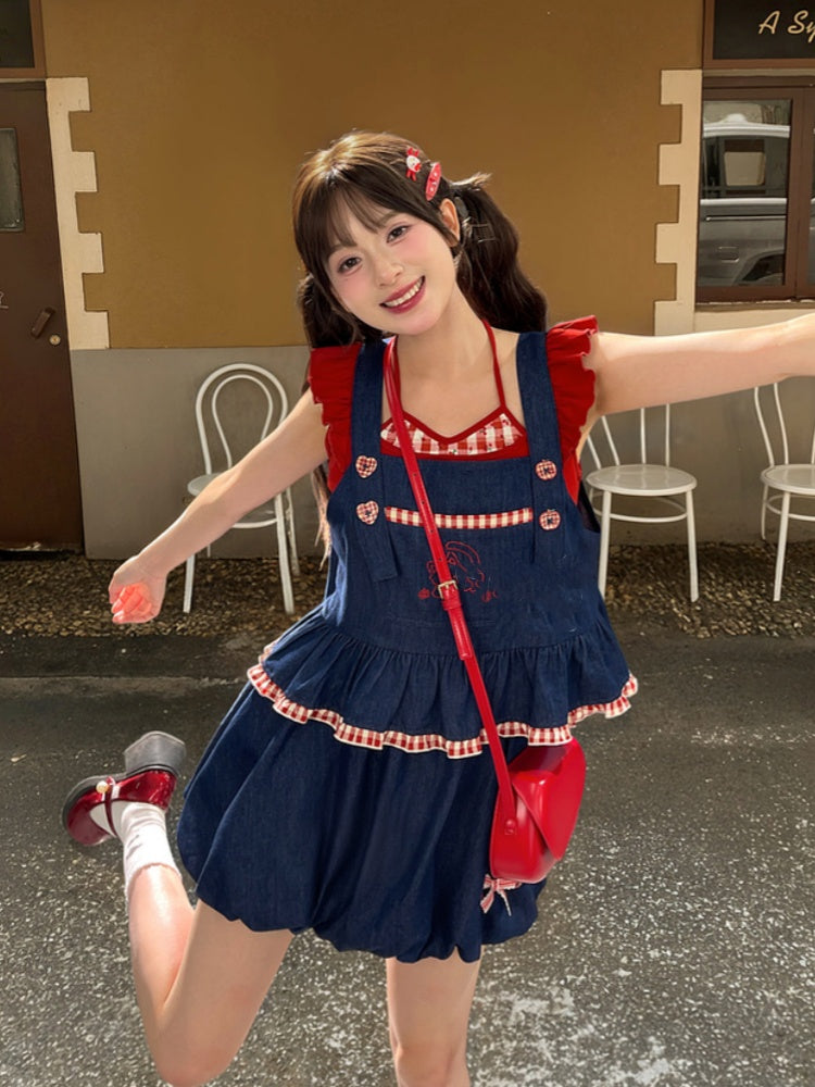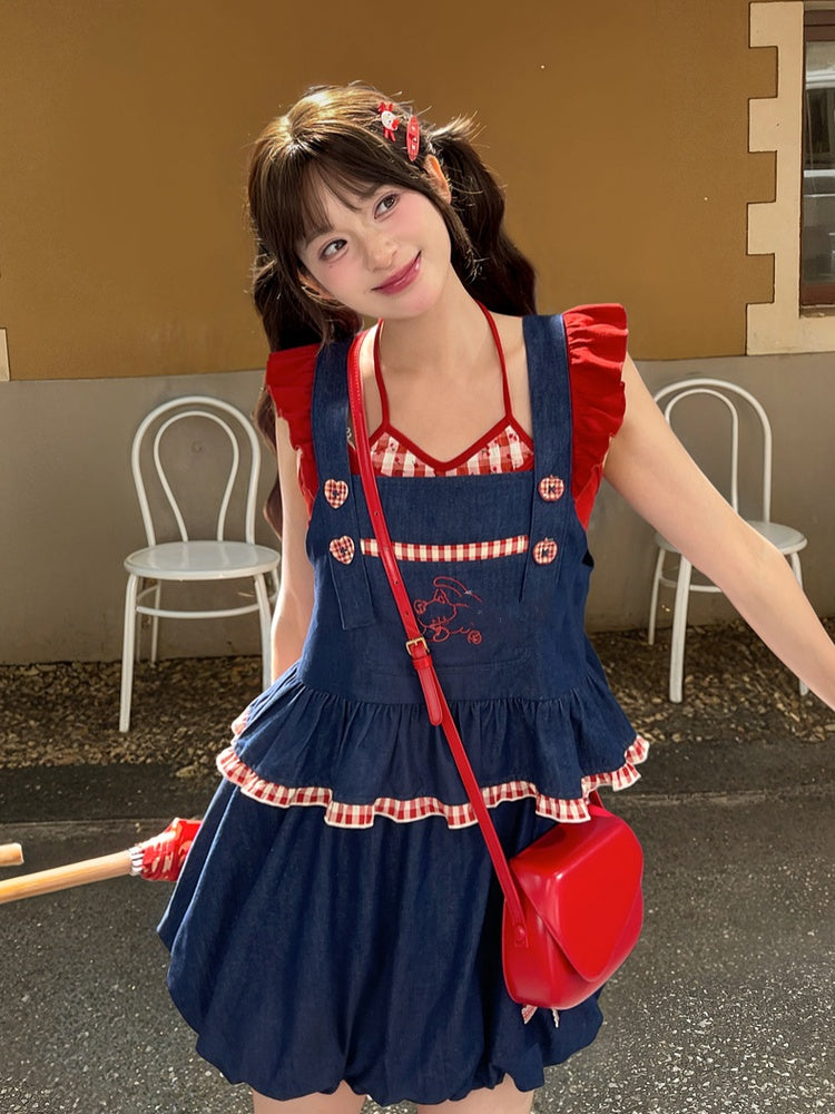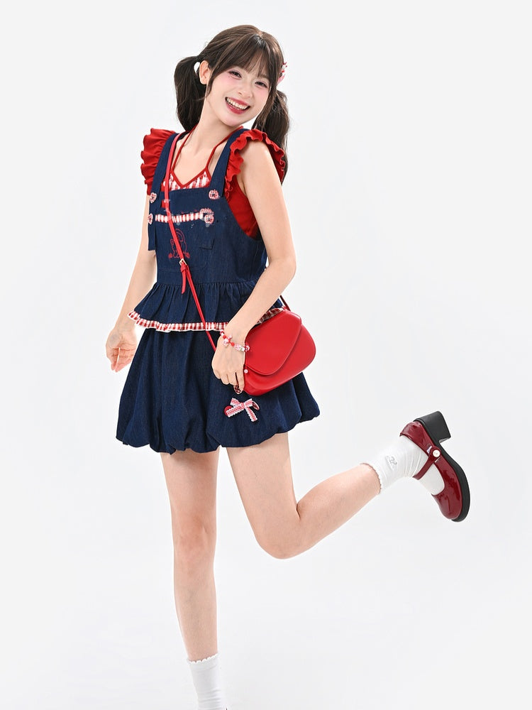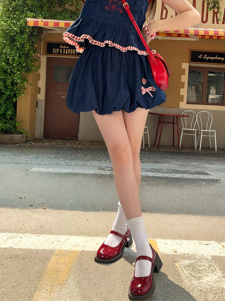 Buttons Faded Wash Denim Bubble Skirt Plaid Blue Elastic Waist