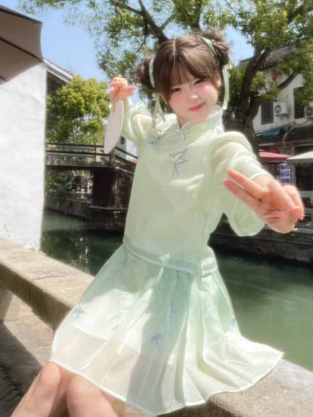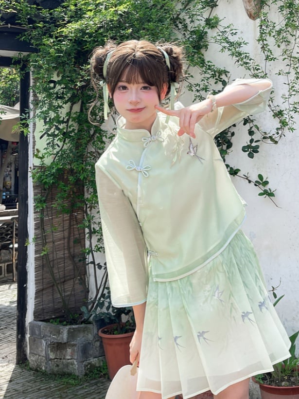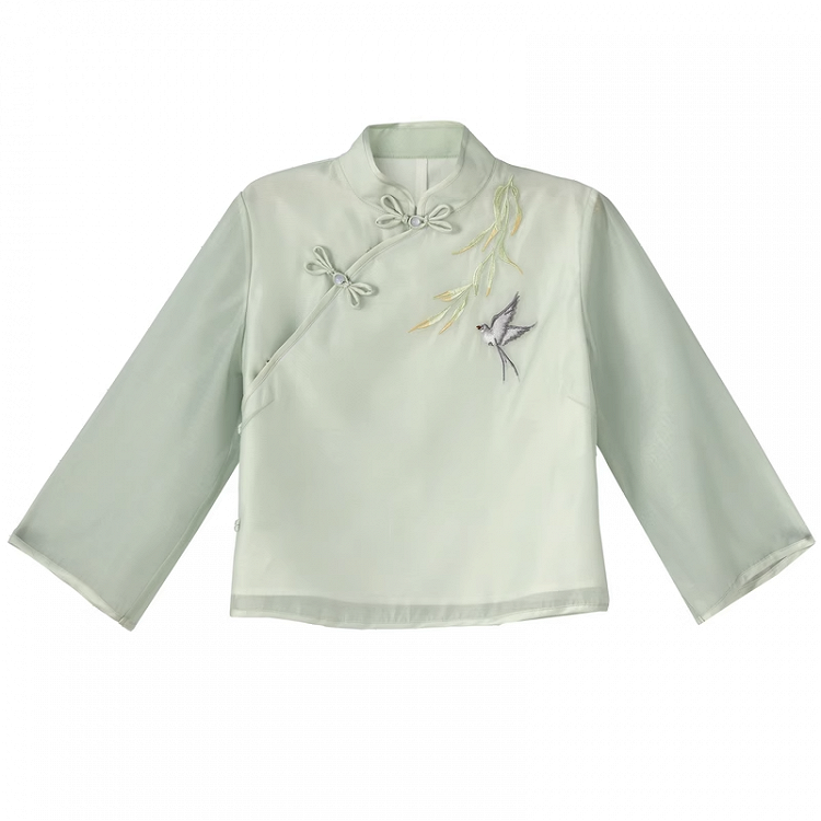 Light Green Banded Collar Knot Buttons Swallow Embroidery Cheongsam Style Top