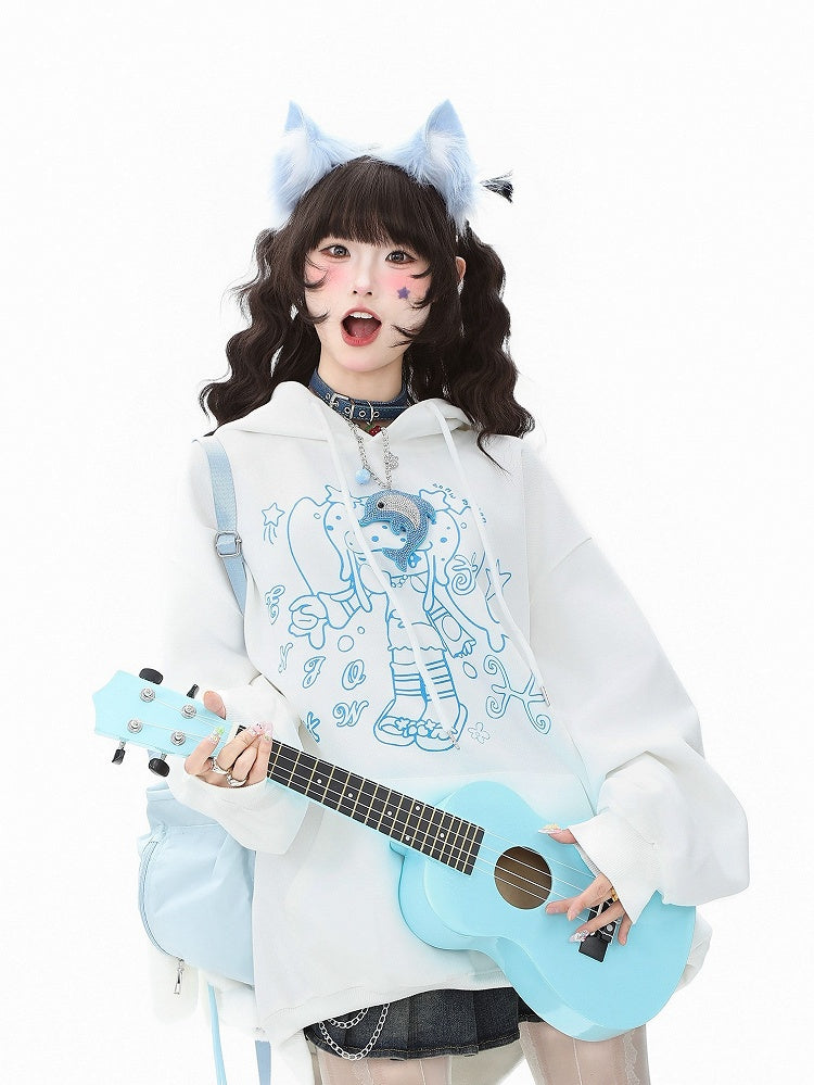 Green/White/Blue Daily Kawaii Hoodie - Cartoon Girl and Star Pattern & Convenient Pocket